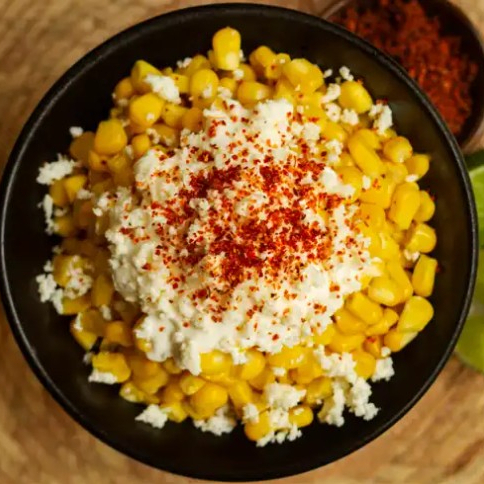 Maíz tierno con pollo en cubo, lechuga, papa chongo, queso costeño, tocineta, salsa tártara y piña en gel.