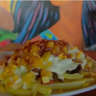 Papa a la francesa con salchicha, cerdo en cubo, lechuga, papa chongo, queso costeño, chips de tocineta, salsa tártara y piña en gel.