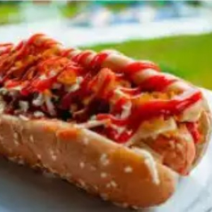 Pan, salchicha americana, papa chongo, queso Mozzarella, cerdo desmenuzado en BBQ, tocineta, chorizo ternera, maíz, salsa tártara.