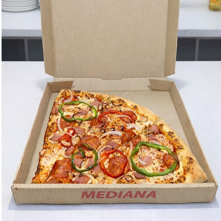 Pizza Mediana de 30 cm, aceitunas verdes, pimiento rojo y verde, cebolla, champiñones y queso mozzarella.