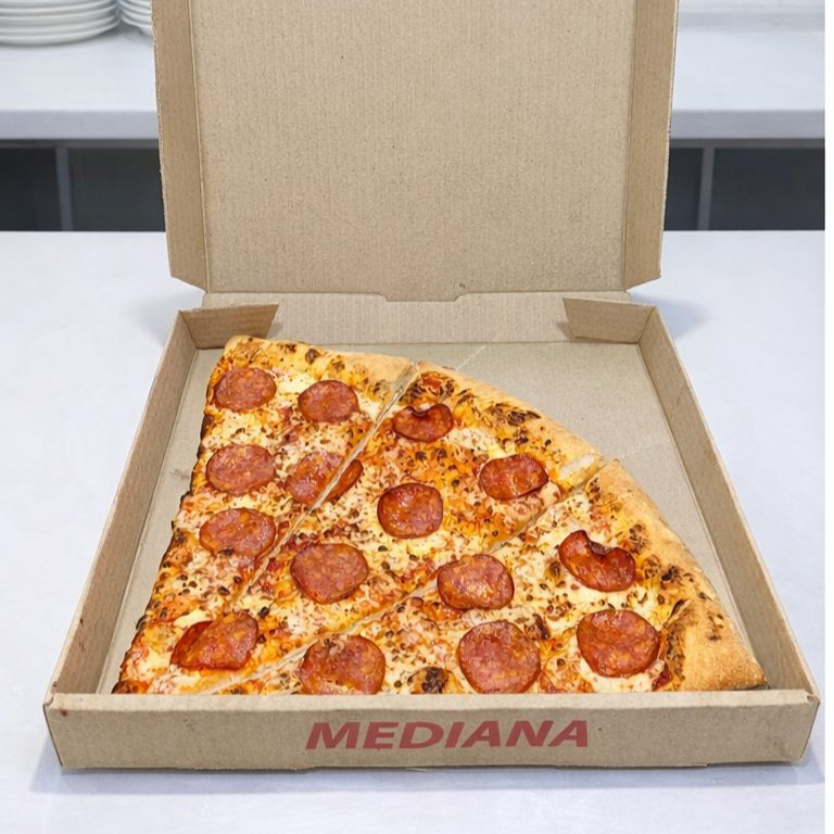 Pizza de 30 cm, pepperoni y queso mozzarella.