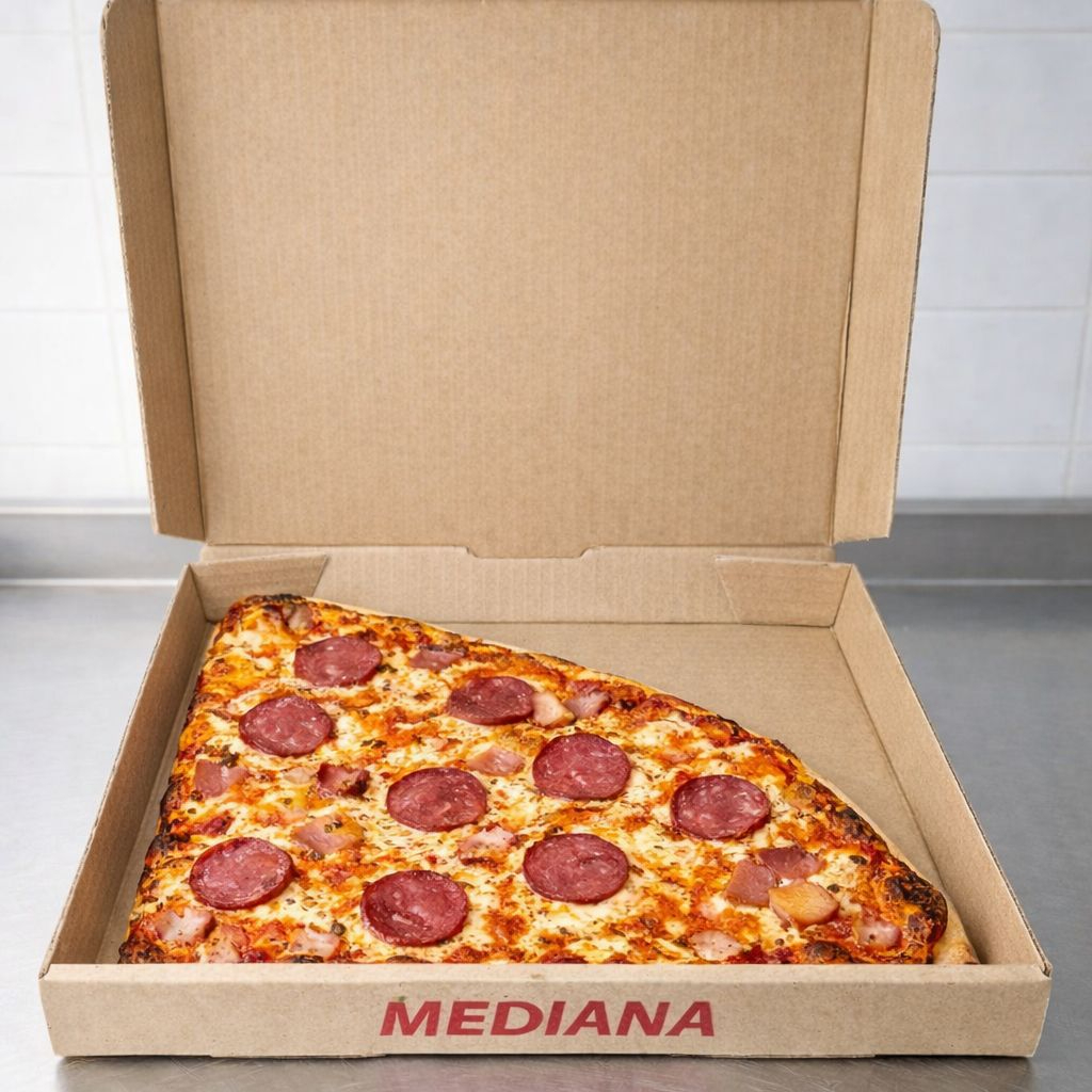 Porcion de 30 cm cortada en 3 porciones grandes. Una opción abundante y rendidora, con salsa napolitana, queso mozzarella, jamón, pepperoni, cebolla blanca y pimentones.