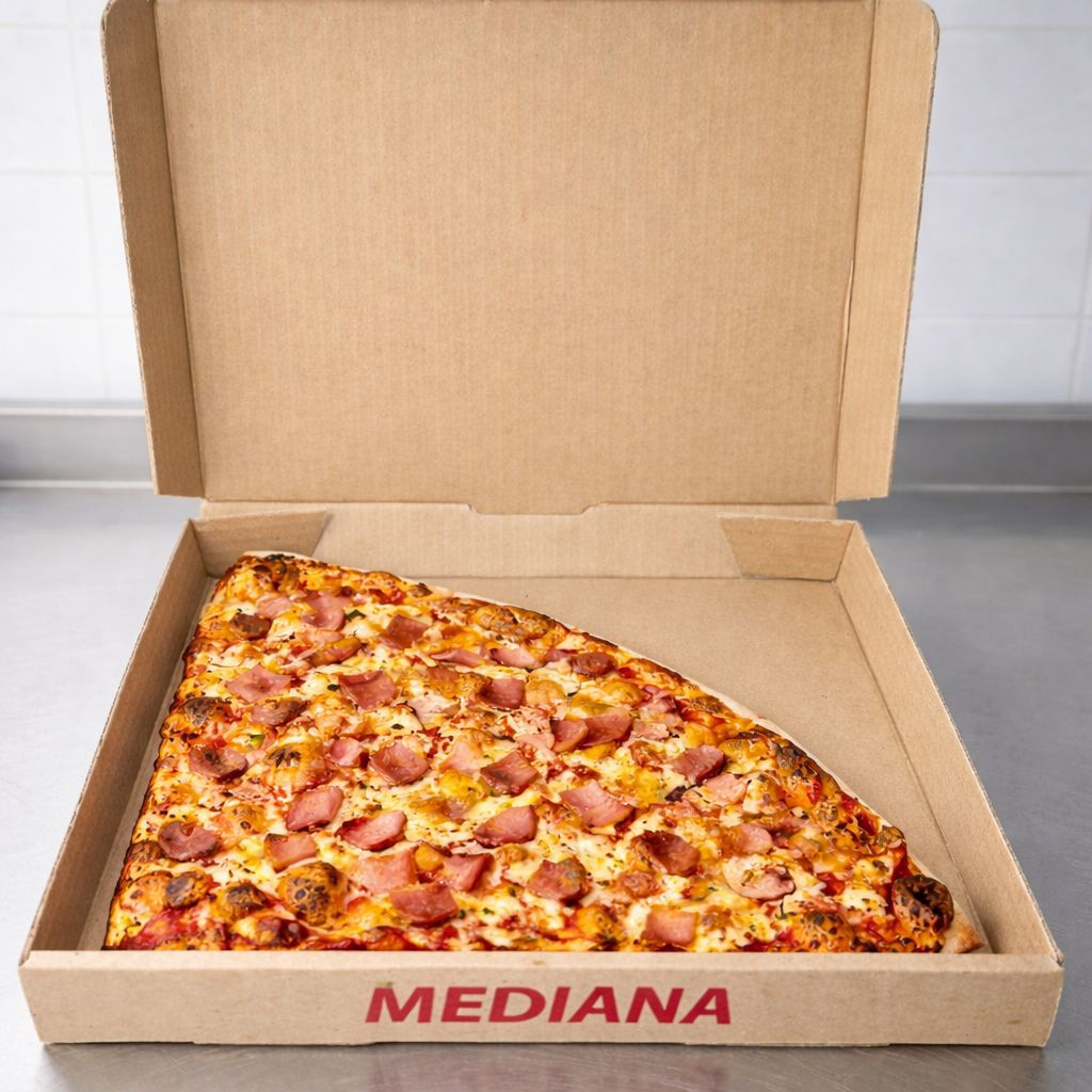 Porcion de 30 cm cortada en 3 porciones grandes. Más rendidora que una porción tradicional, con salsa napolitana, abundante queso mozzarella y jamón.