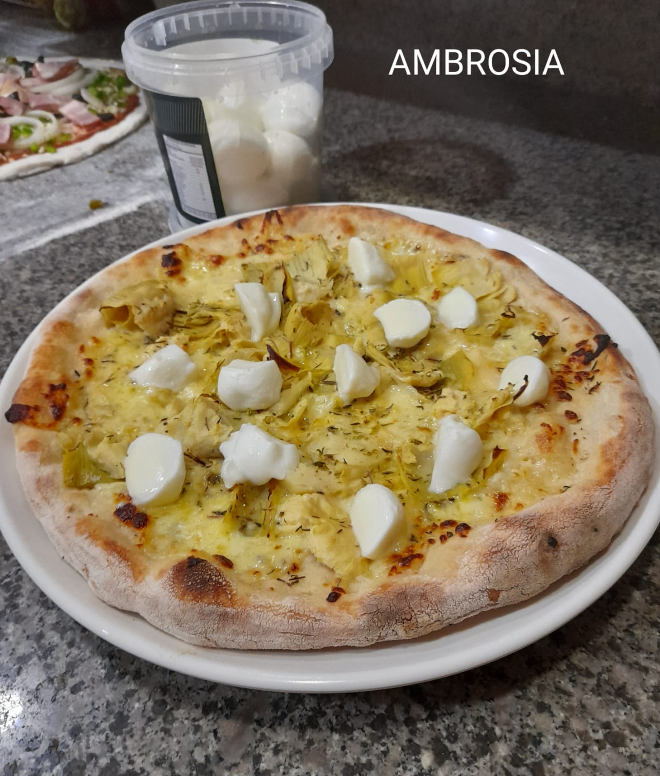 Ingredientes: mozzarella, corazón de alcachofa importado, parmesano, mozzarella de búfala, ralladura de cáscara de limón y tomillo.