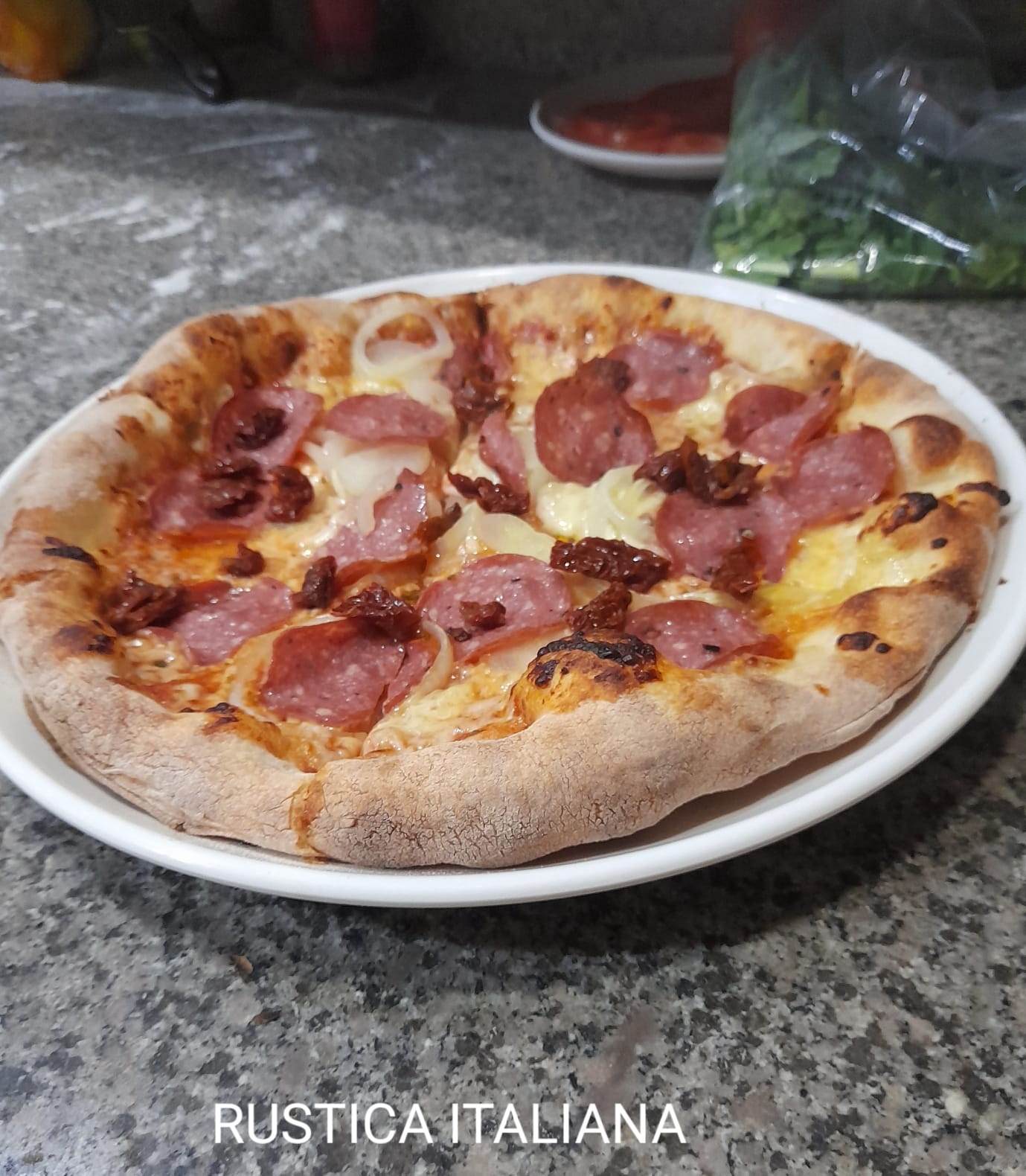 Ingredientes: pasta de tomate, mozzarella, tomates secos, salami italiano y cebolla.
