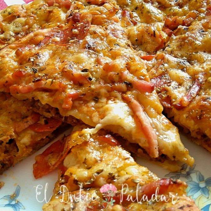 Queso mozarella, salsa pomodoro, jamón, trozos de piña y pollo desmenuzado.