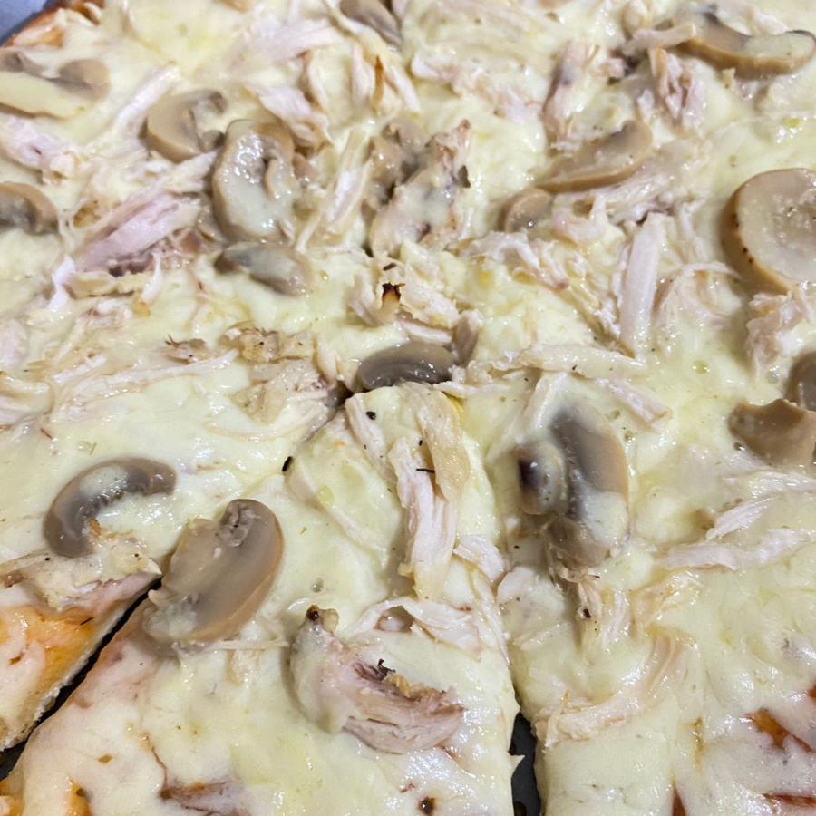 Pizzeta de 27Cm, 8 porciones,Queso mozzarella, pollo, champiñón.