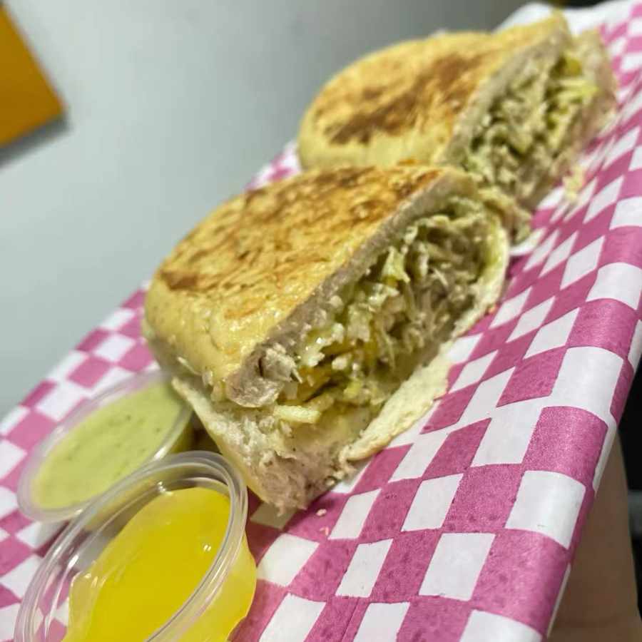 Pan a la parrilla, pollo desmechado, lechuga, cebolla, tomate,salsas de la casa y papas a la francesa