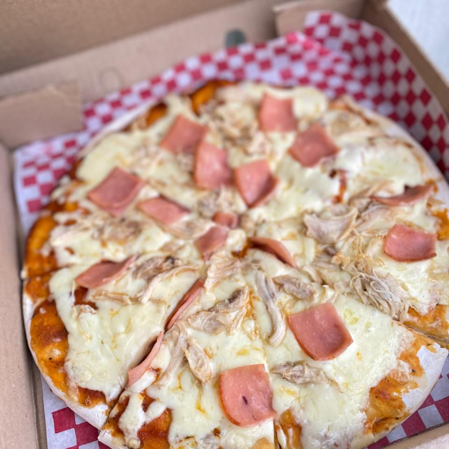 Pizzeta de 27cm, 8 porciones,Queso mozzarella, jamón, piña.