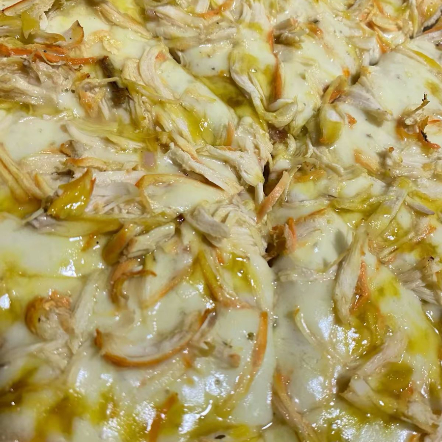 Pizzeta 27Cm, 8 porciones ,Queso mozzarella, pollo desmechado en salsa miel mostaza.
