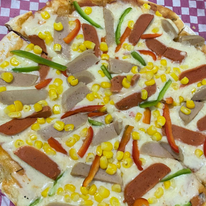 Pizzeta de 27Cm, 8 porciones,Queso mozzarella, chorizo,Butifarra,chongo, tartara y piña