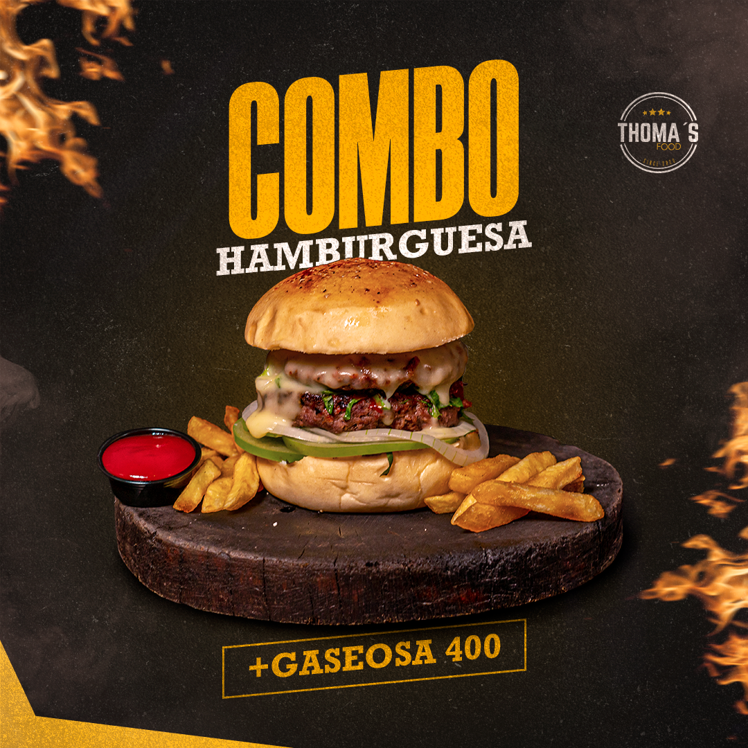 Hamburguesa con pan brioche y pollo pechuga acompañada con 100 g de papa a la francesa.