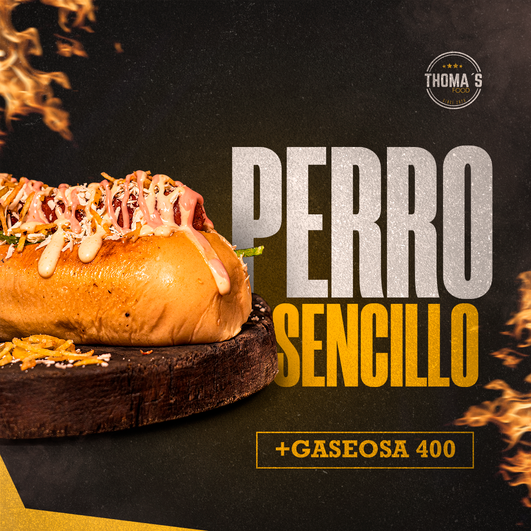 Perro caliente salchicha suiza, queso costeño, chongo, verduras y salsas de la casa.