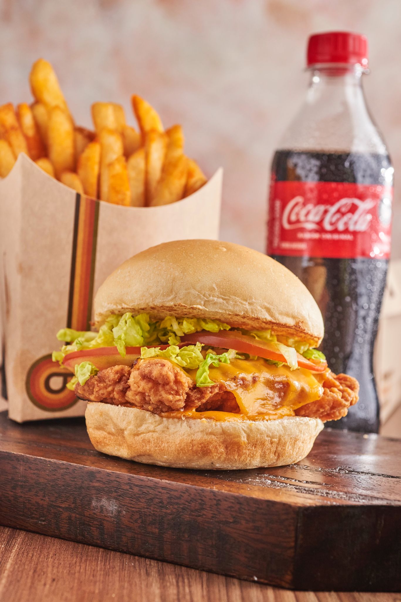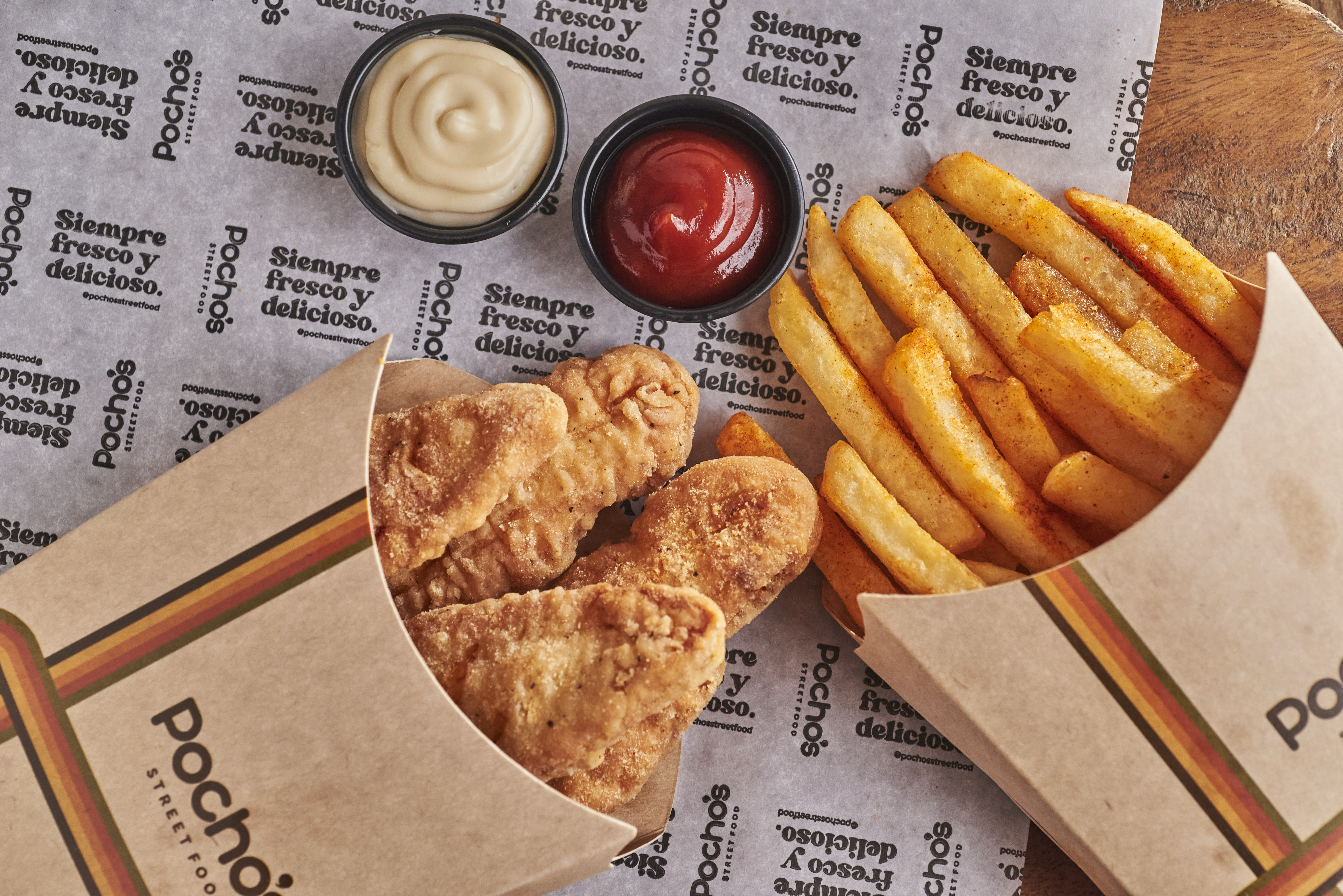 Pan de la casa, pechuga de pollo apanada, verduras frescas y Salsa Pocho's.