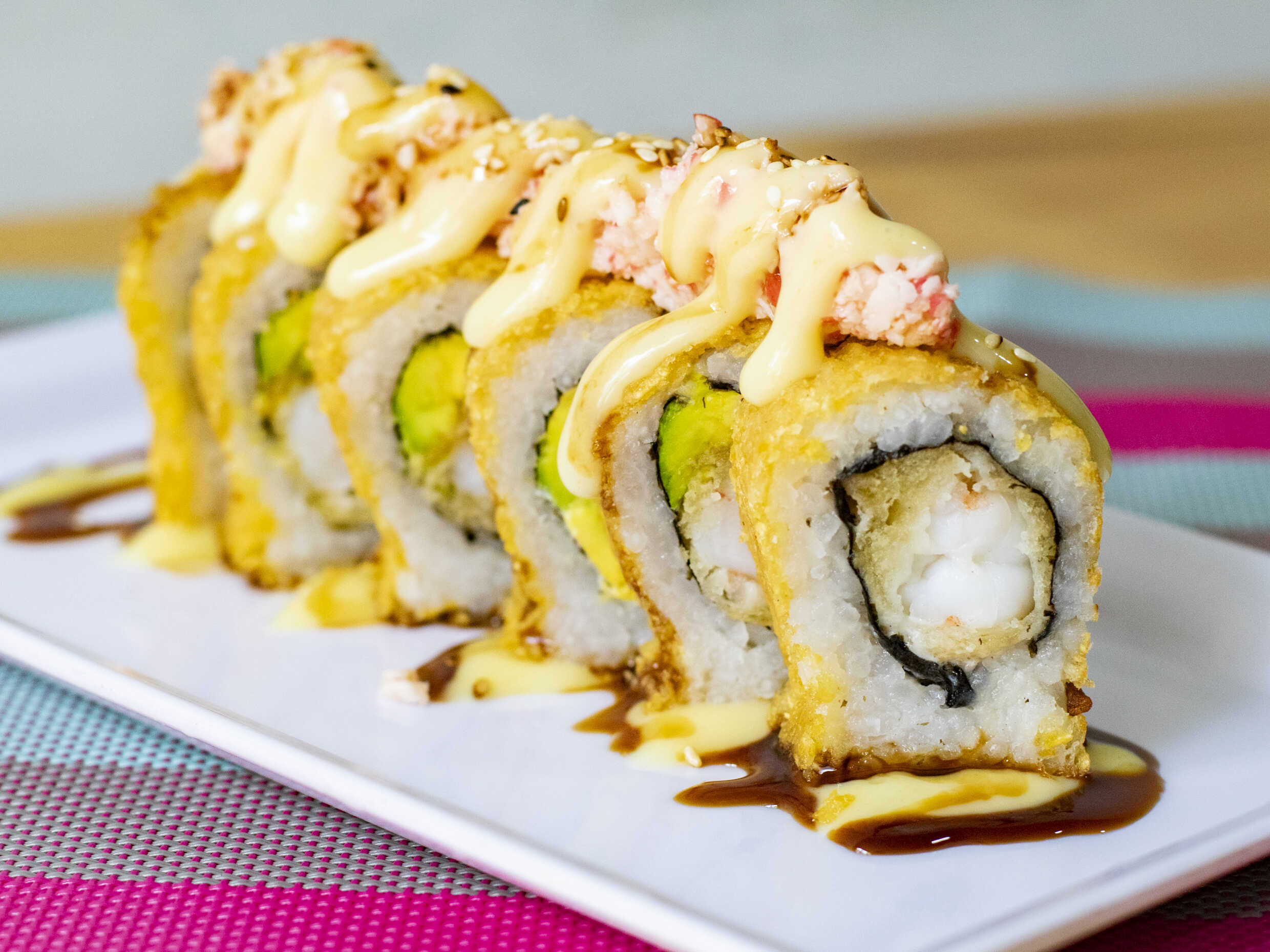 Roll relleno de queso crema, aguacate, maduros, camarón tempura, siracha con topping de ensalada de cangrejo, crema de leche y maní.(futomaki tempura).