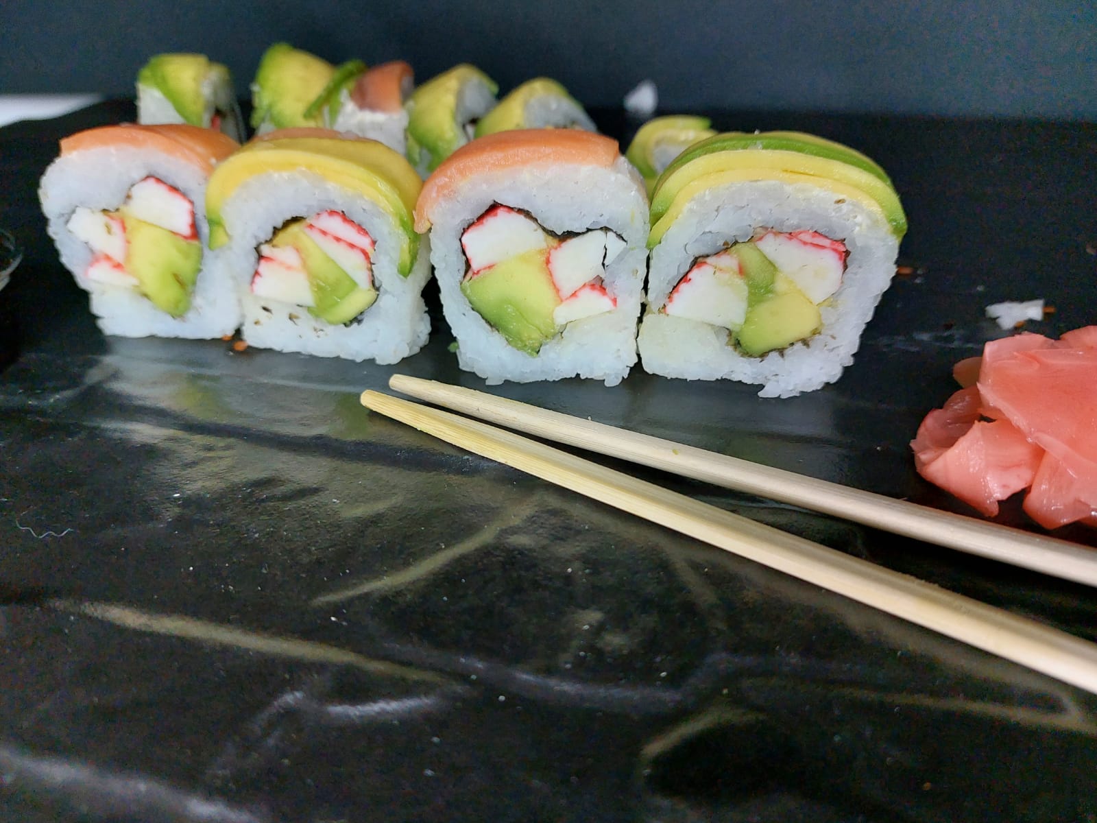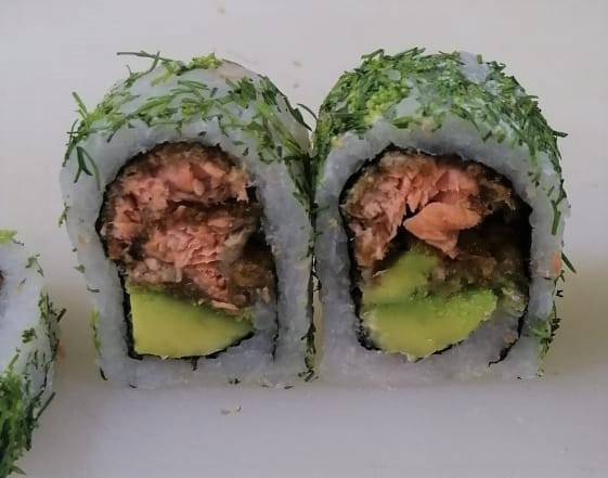 Roll relleno de aguacate, palmito fresco, salmón fresco y salsa spicy. (roll futomaki).
