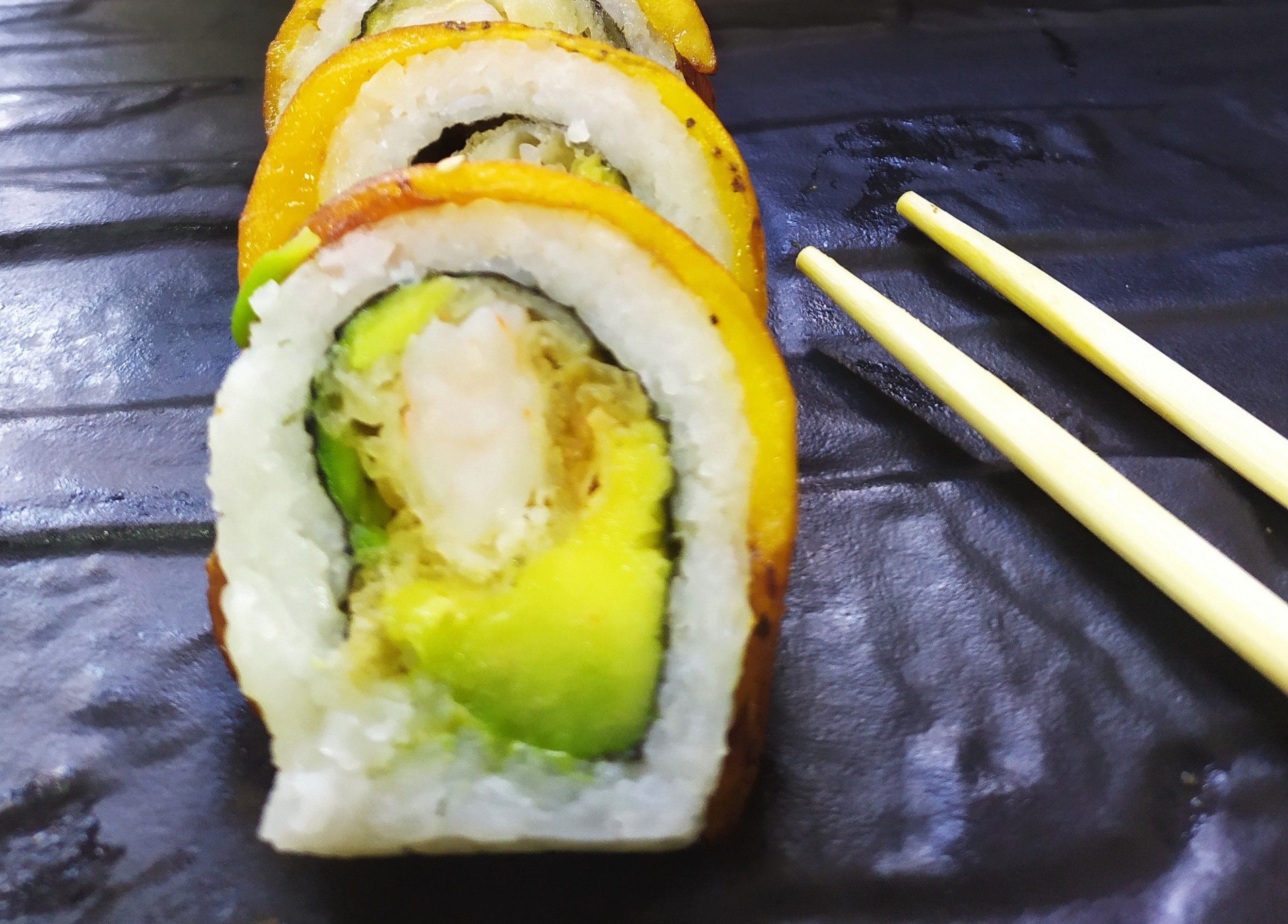 Roll relleno de queso crema, aguacate, camarón tempura con topping ensalada cangrejo y salsa anguila.(roll futomaki tempura).
