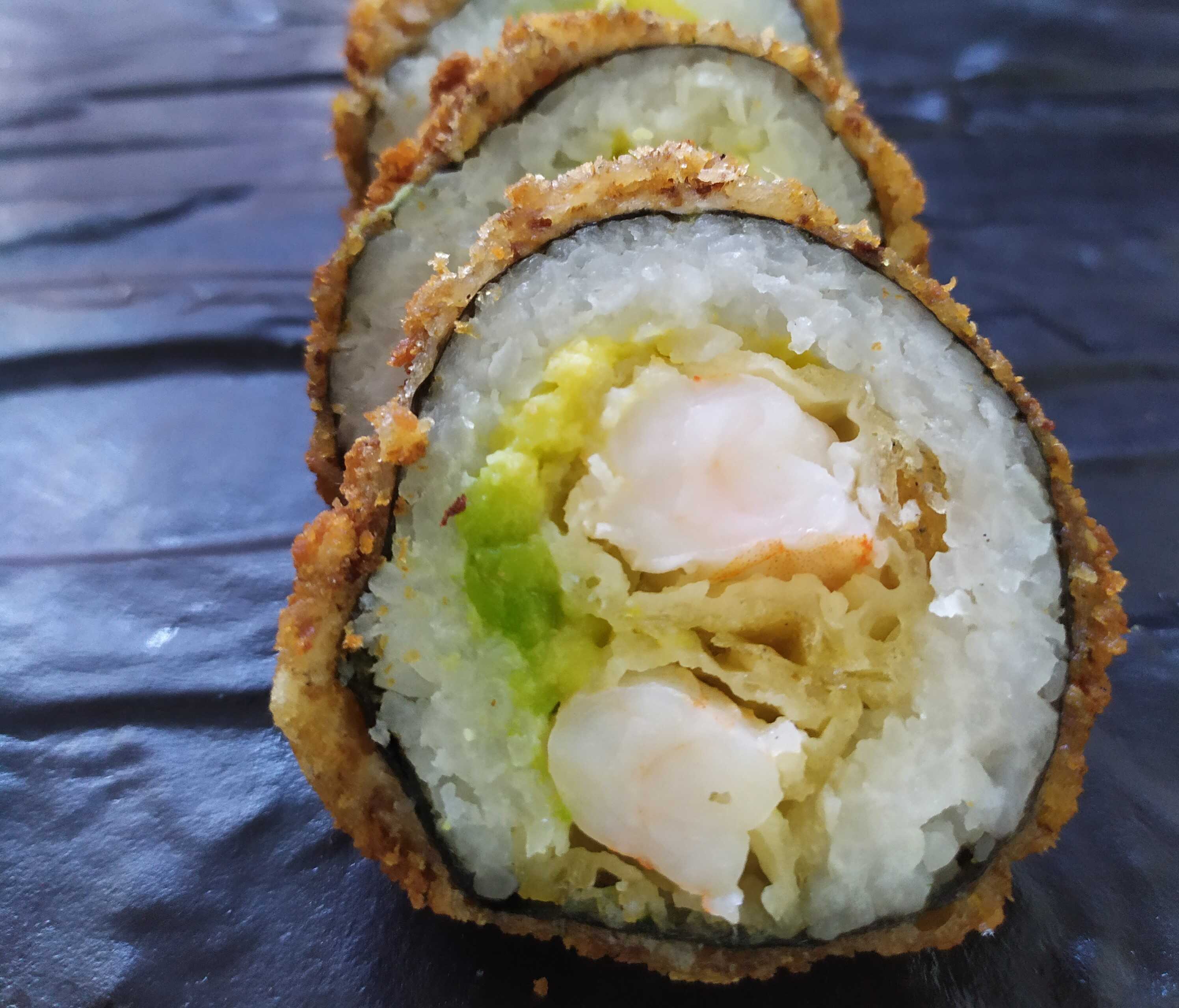 Roll relleno de queso crema, palmito crispí, cebolla larga y camarones.(rollo futomaki tempura).