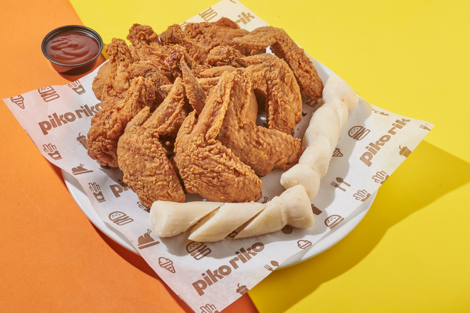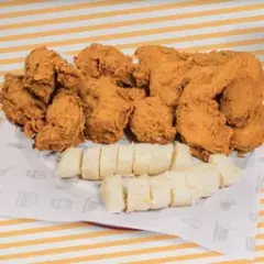Veinticuatro unidades de alitas apanadas más 2 bollos limpios.