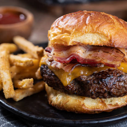 pan, carne de res, queso americano, tocineta, papinillos, lechuga, cebolla, tomate.