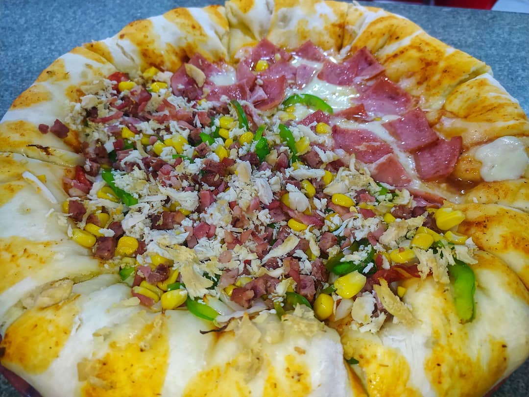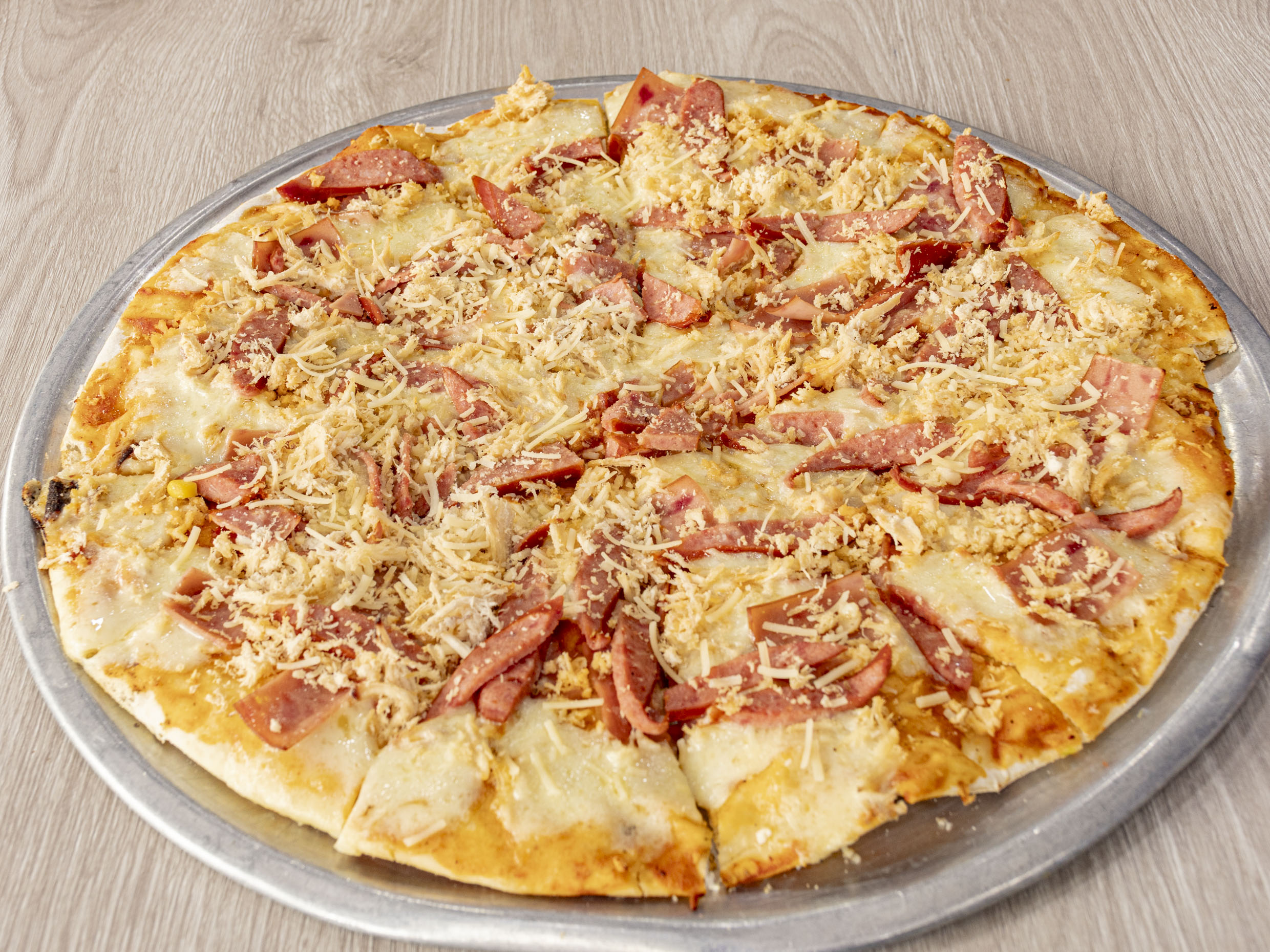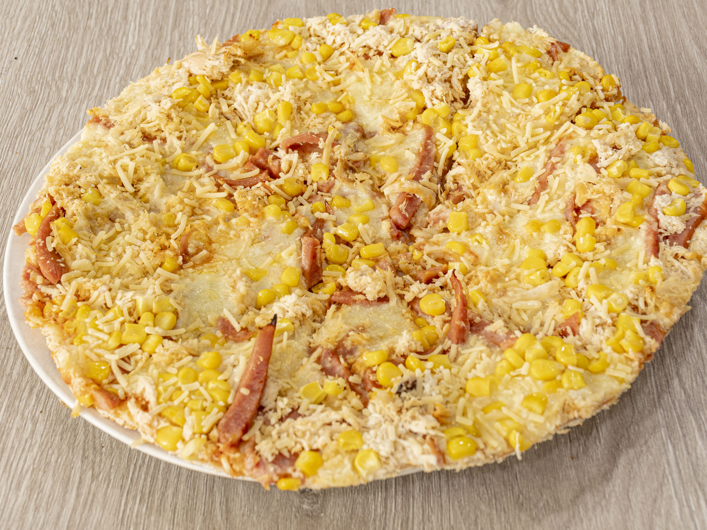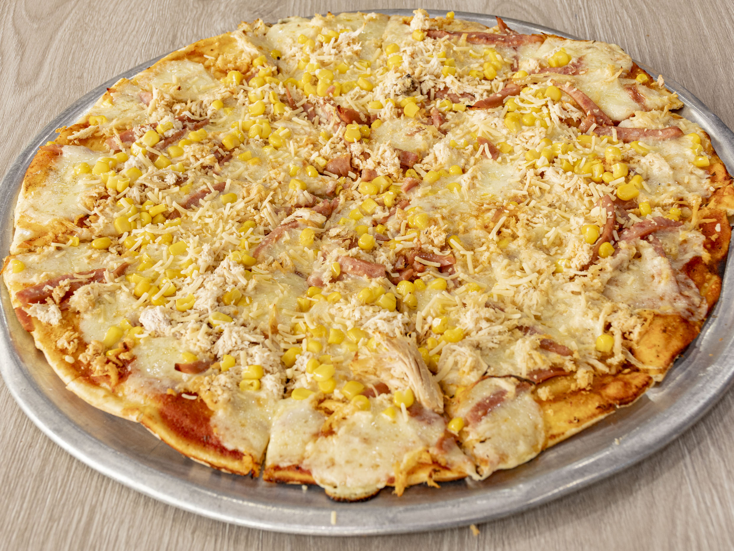 Pizza 12 porciones. Ingredientes: salchicha Ranchera, pollo y maíz tierno, bañada en queso parmesano.