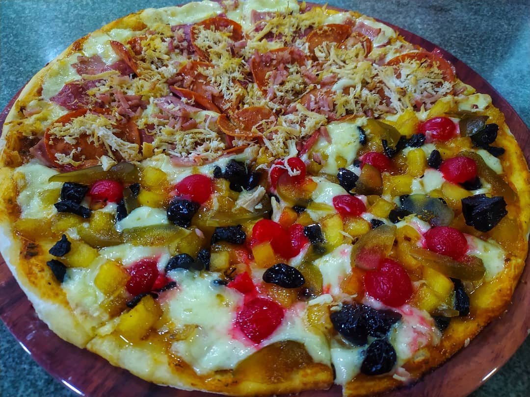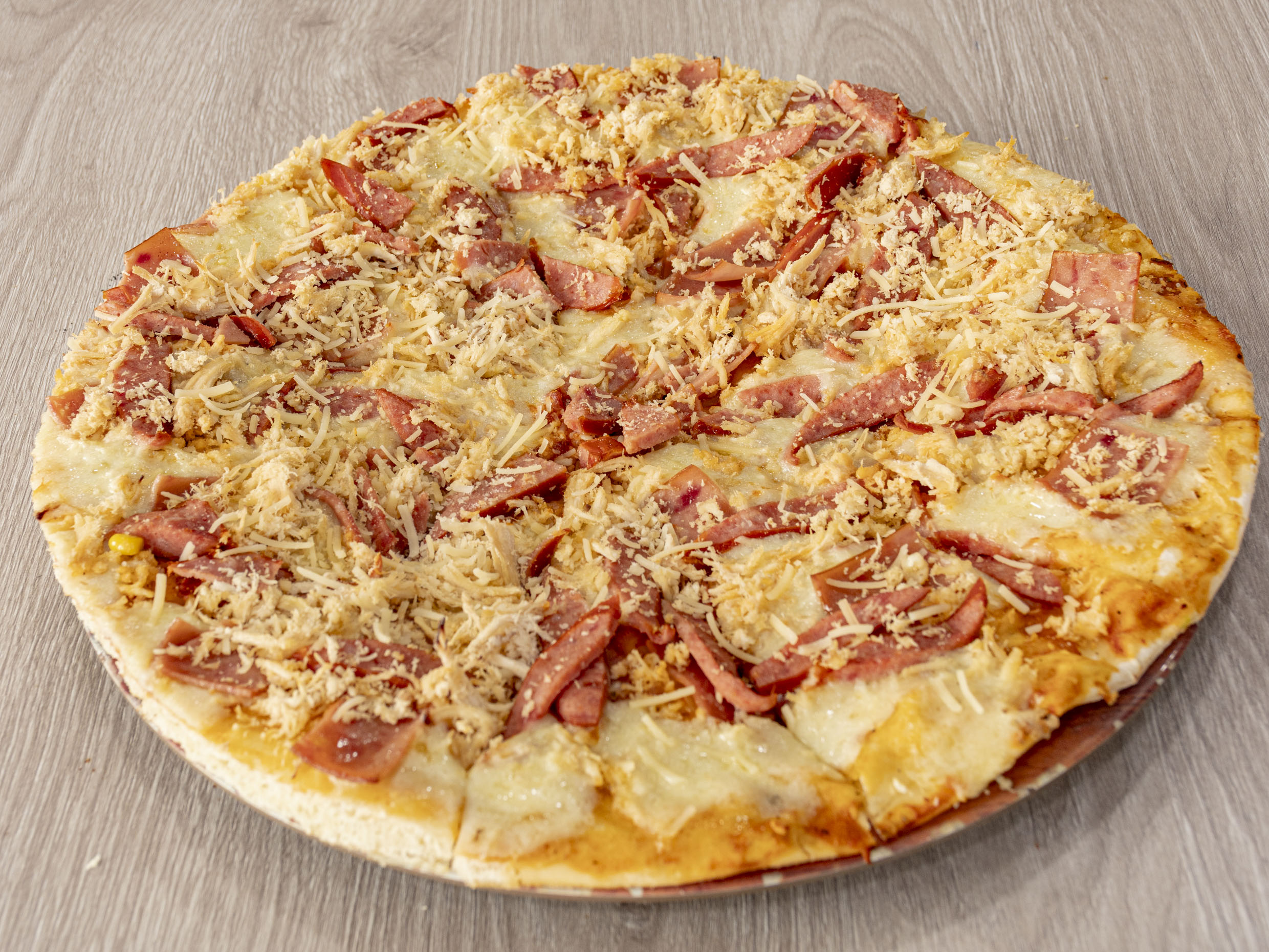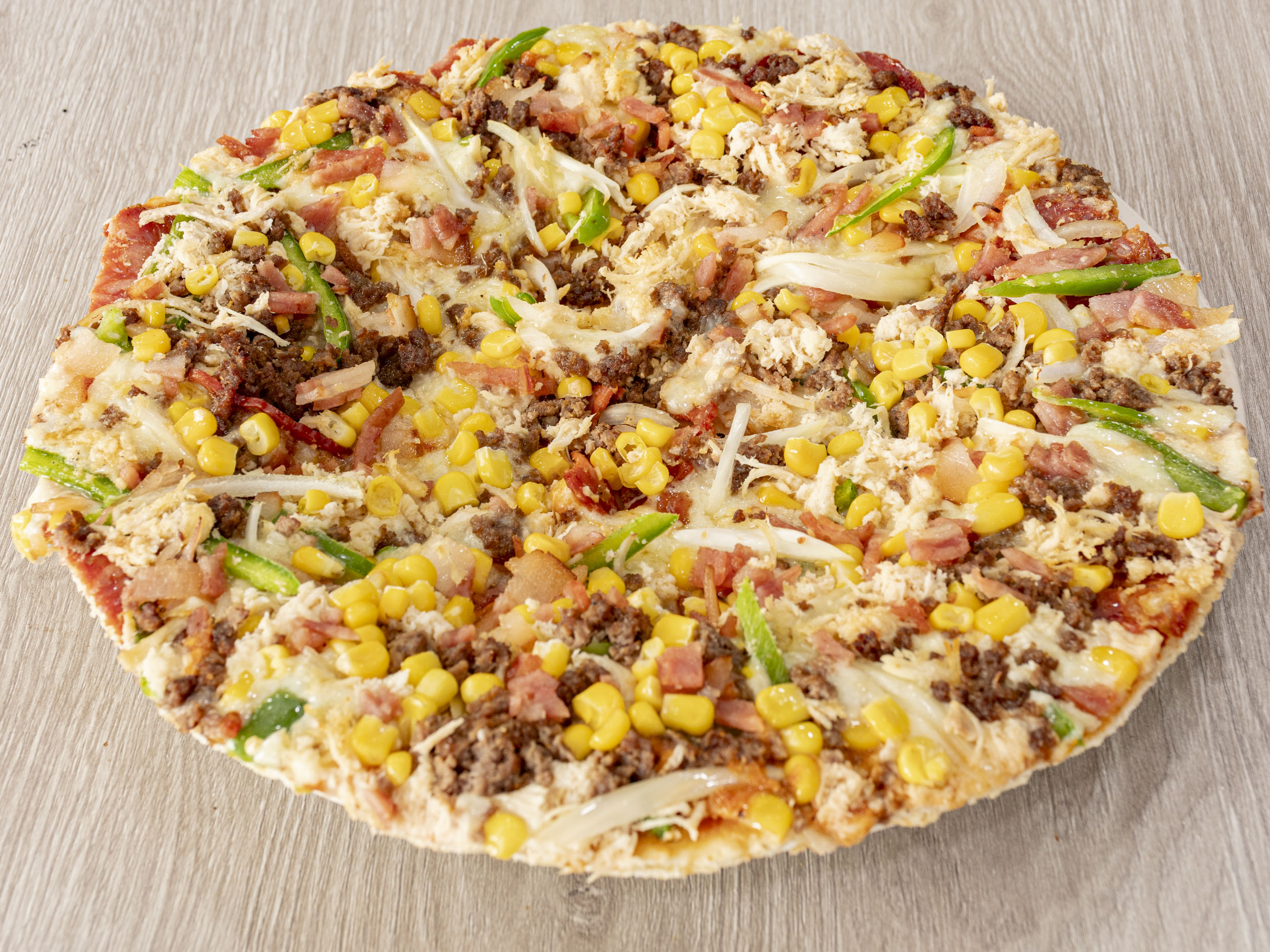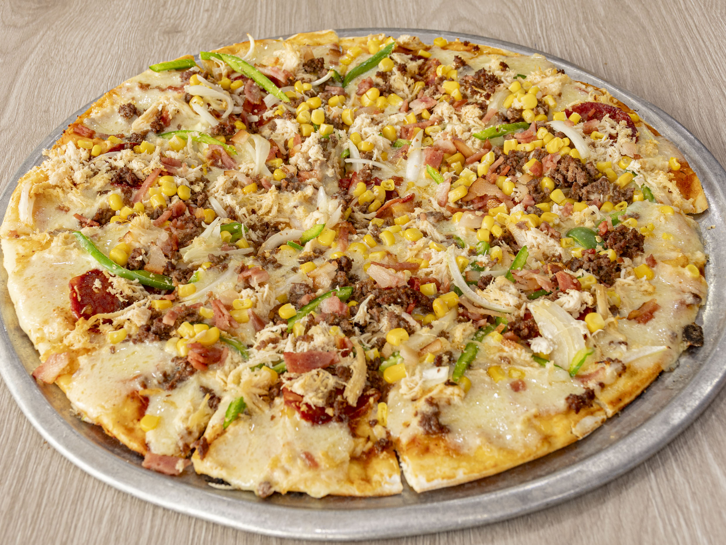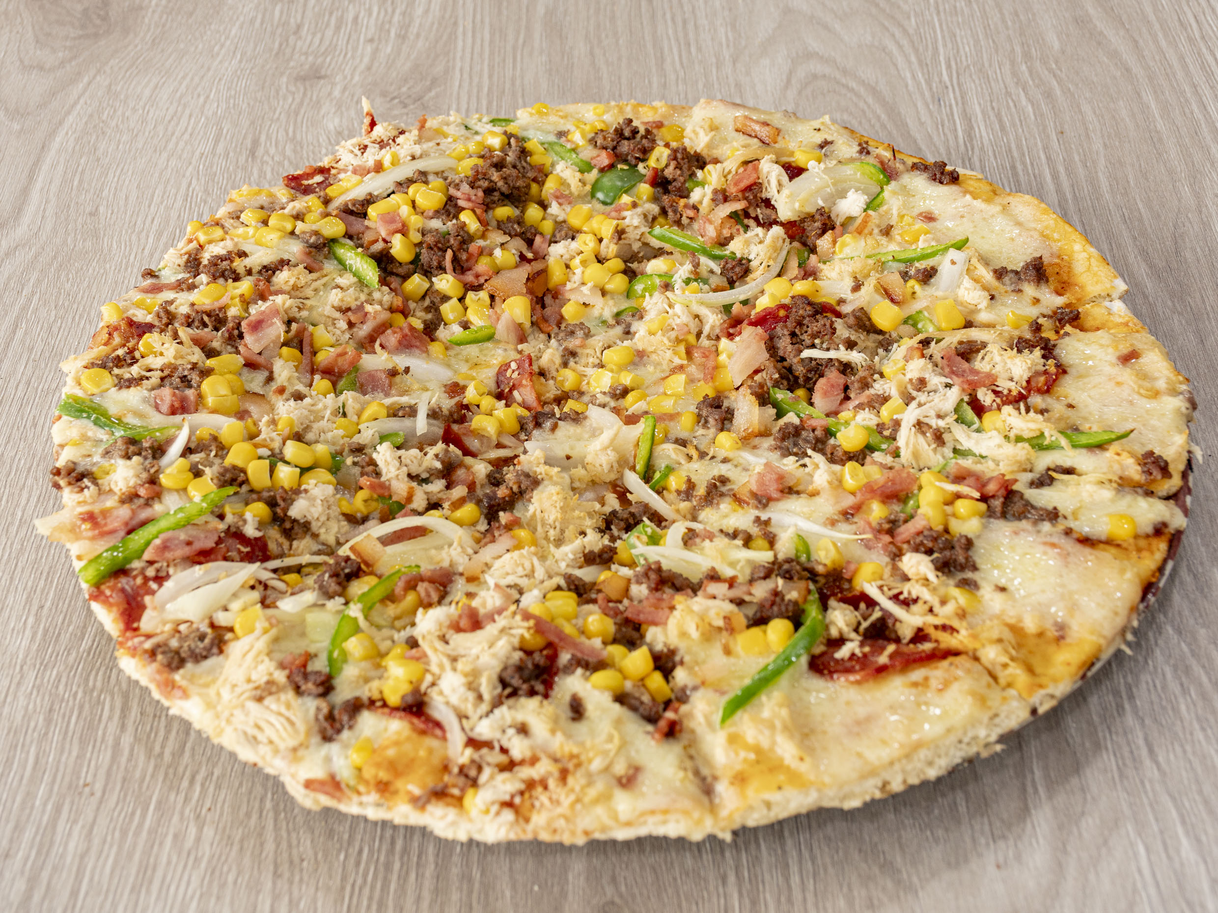 Pizza 8 porciones. Ingredientes: pollo, chorizo español, carne, bolognesa, maíz tierno, tocineta, cebolla, pimentón y queso mozzarella.