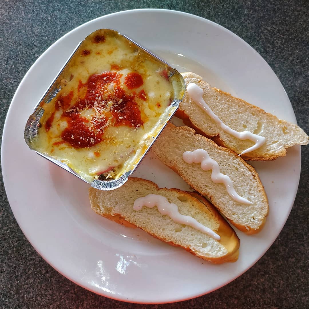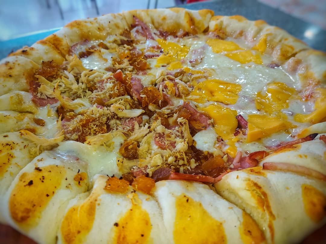 Con queso mozzarella, parmesano, jamón, pollo y champiñones.