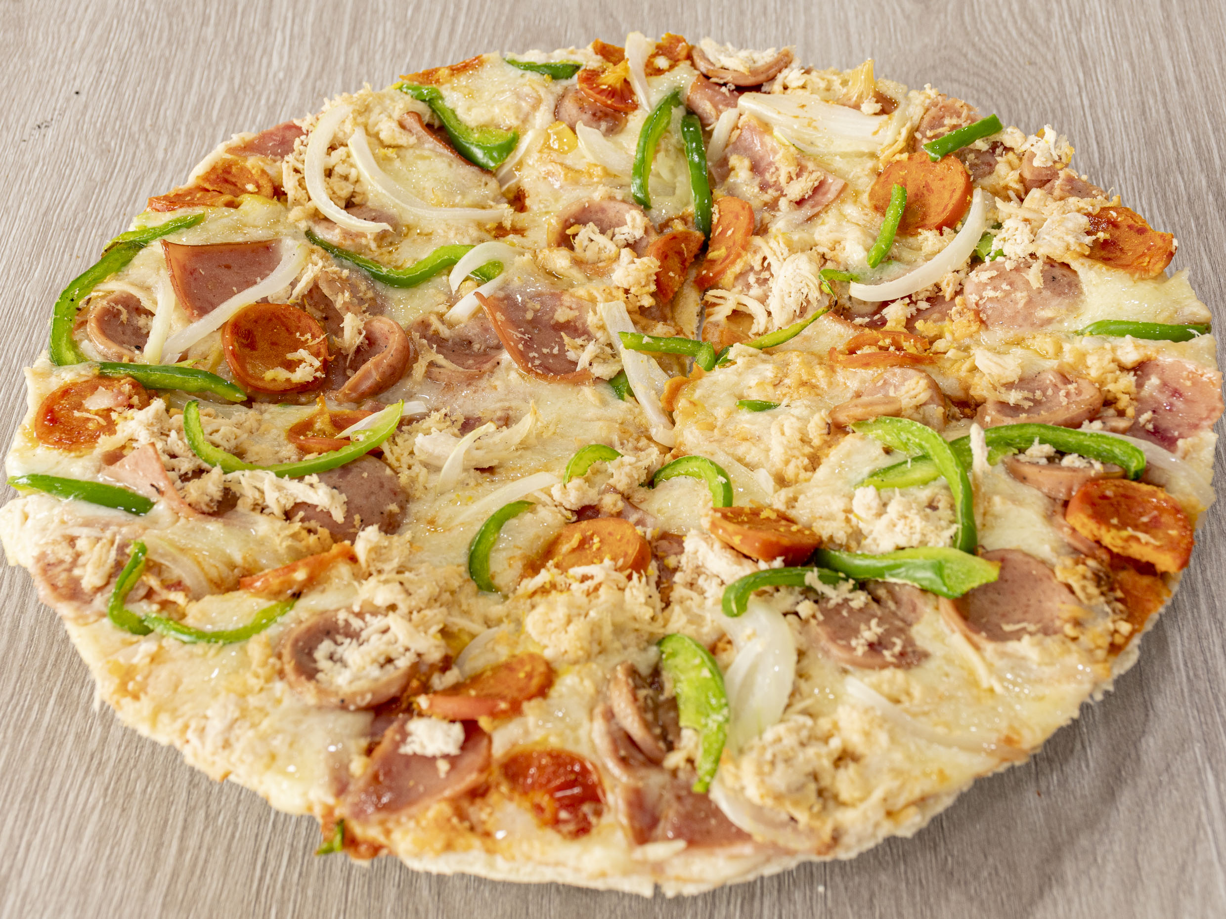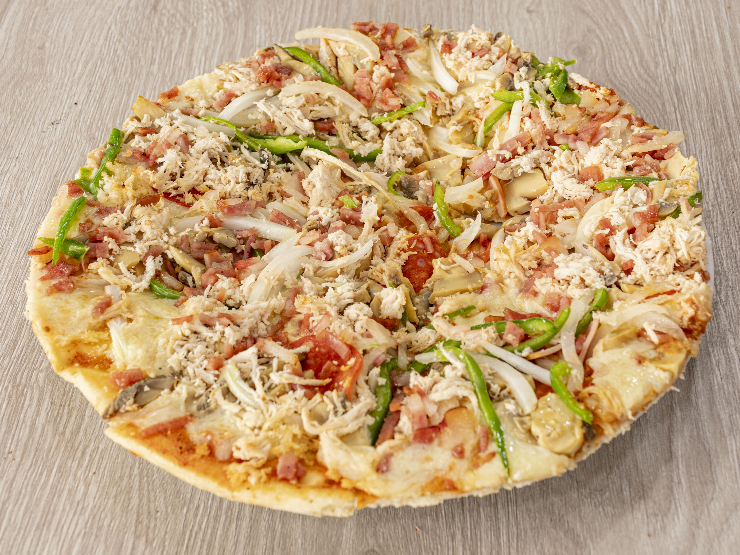 Pizza 8 porciones. Ingredientes: tocineta, pollo, chorizo español, jamón, champiñón, verduras a su gusto, bañada en queso parmesano.