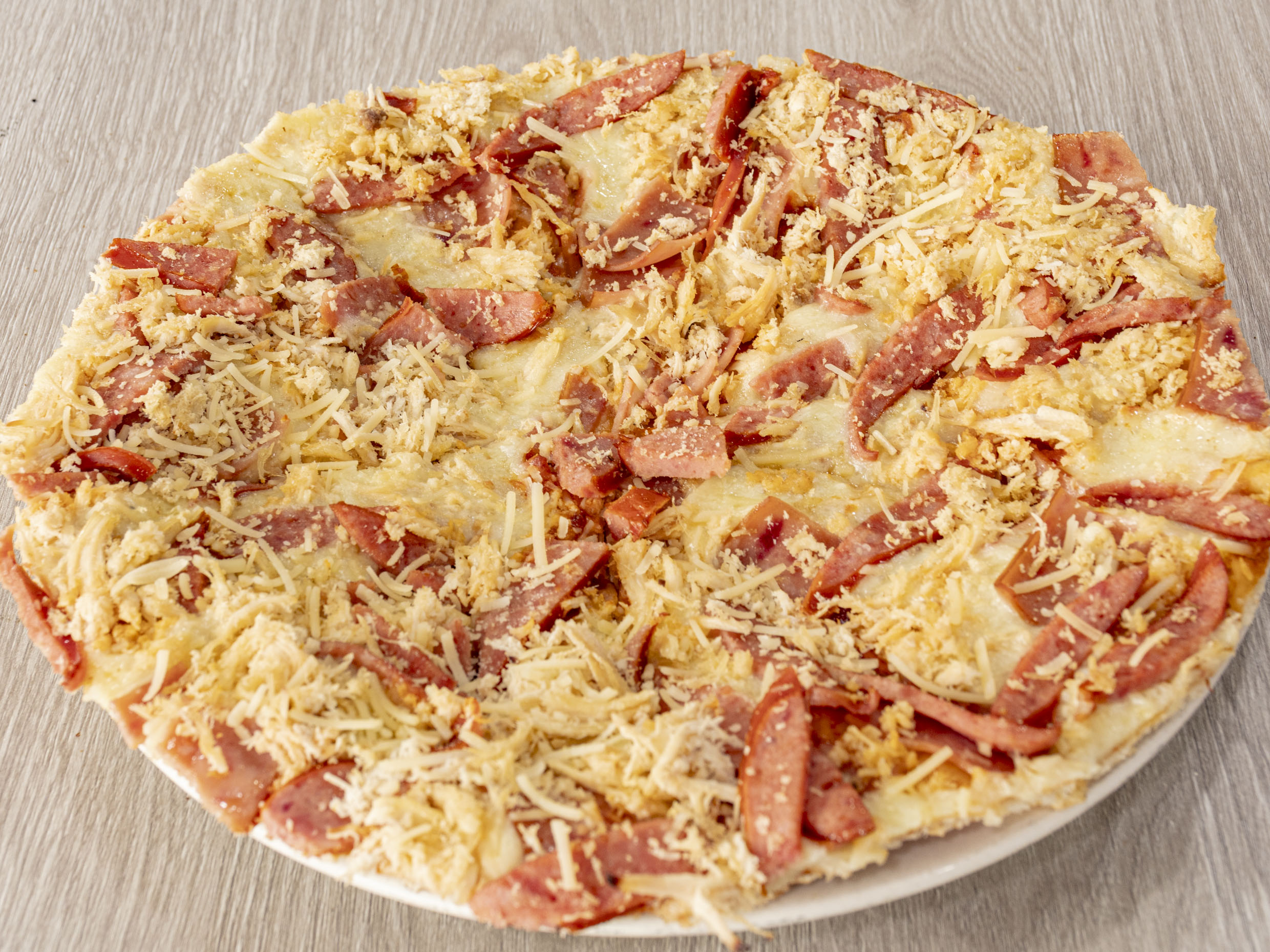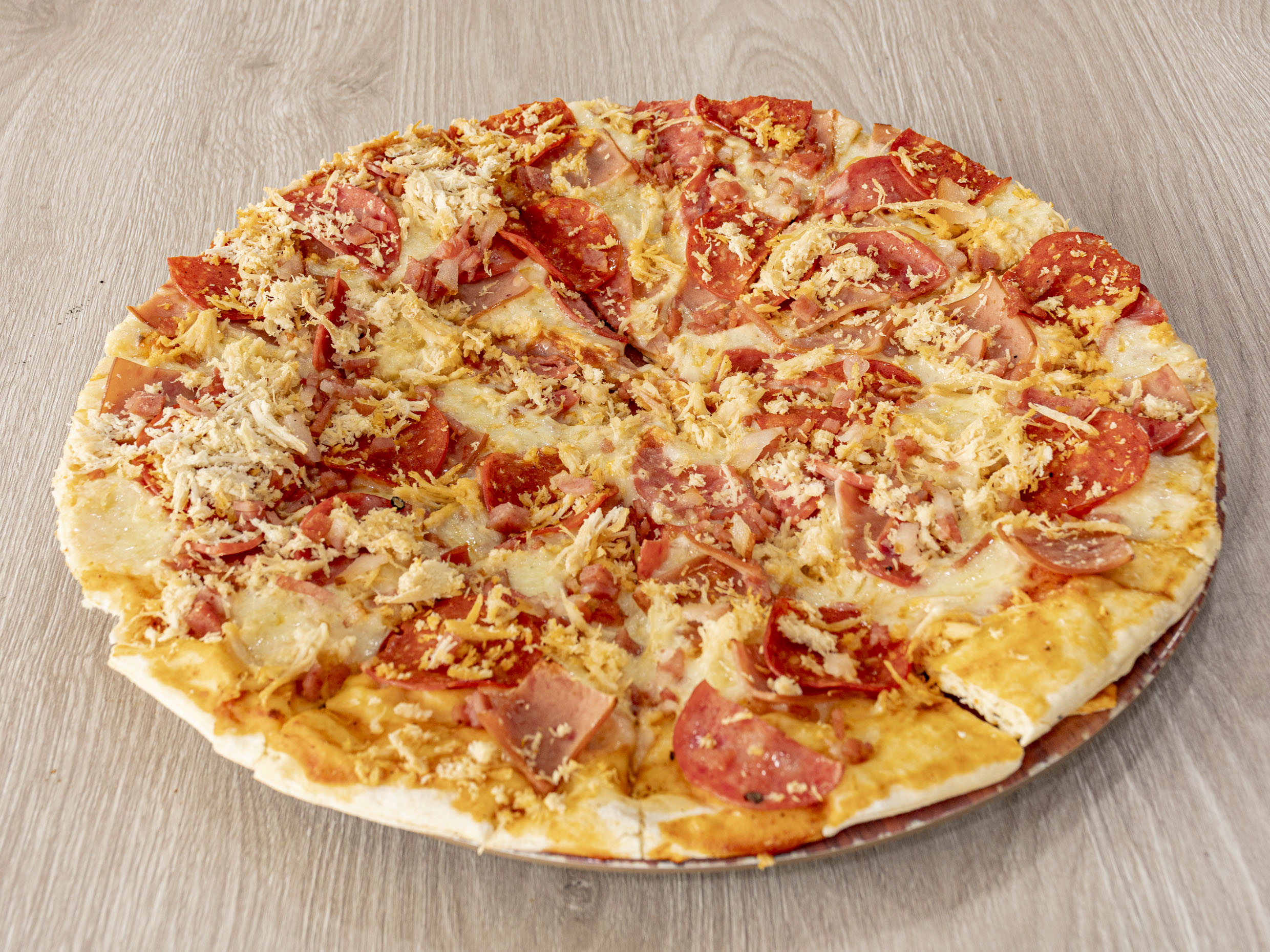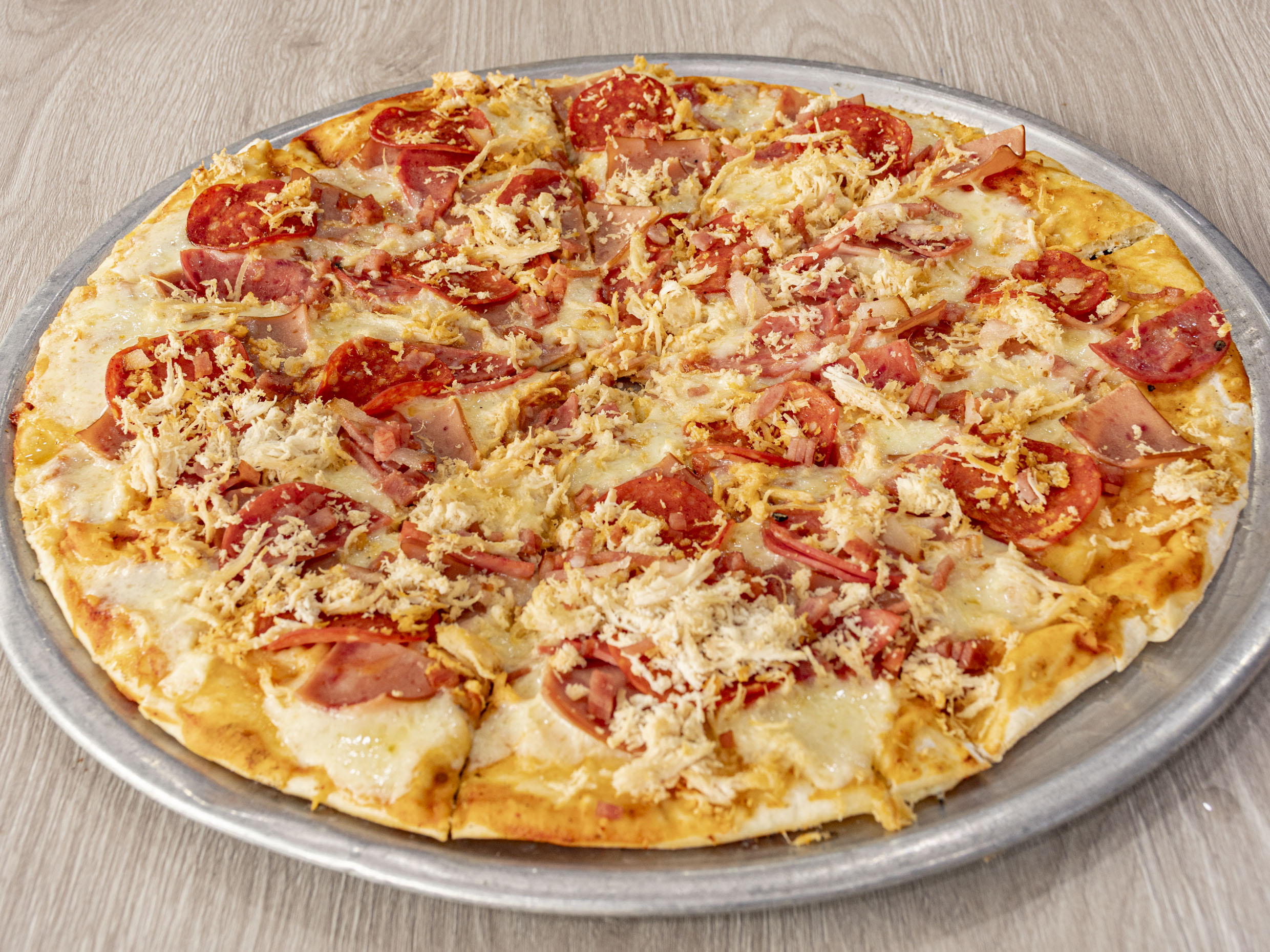 Pizza 12 porciones. Ingredientes: jamón, salami, pepperoni americano, pollo y tocineta.