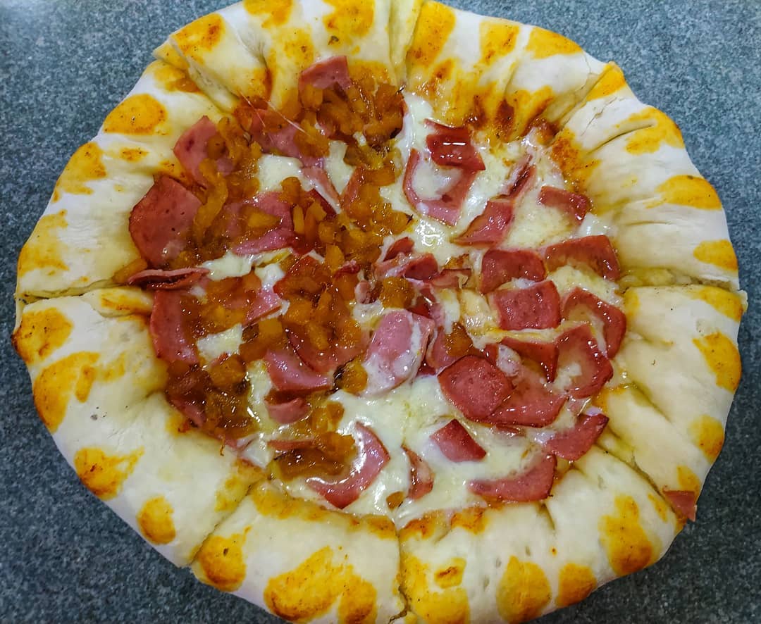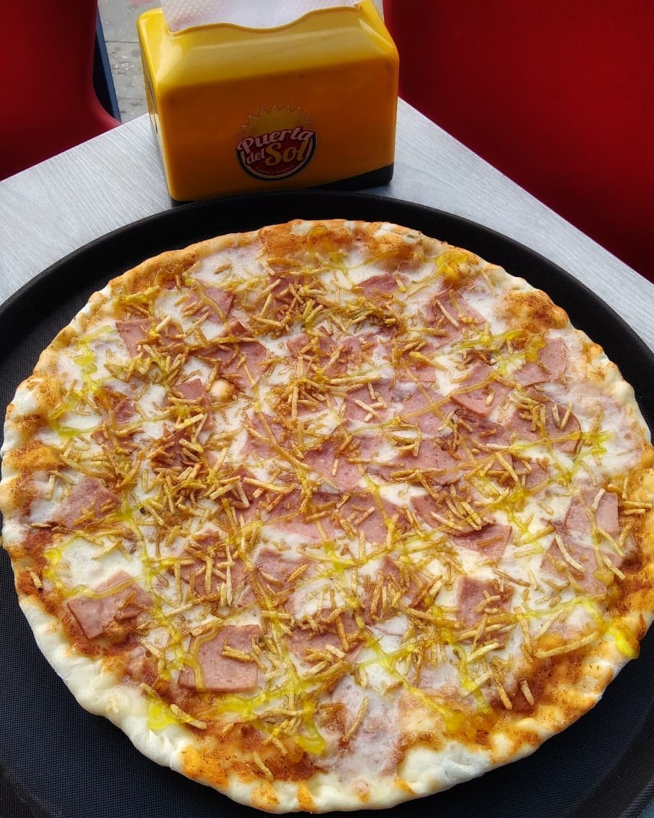 Pizza 8 porciones. Ingredientes: Jamón, papita ricito, gel de piña, tártara.