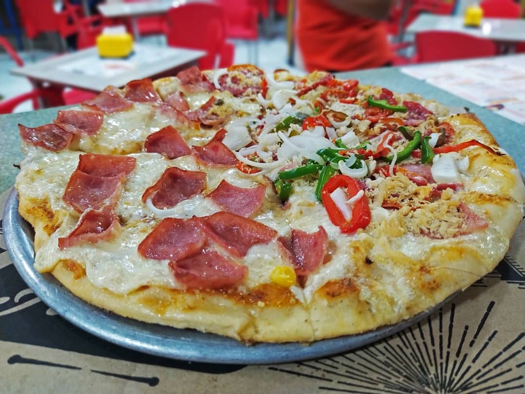 Pizza 12 porciones. Ingredientes: chorizo español, butifarra, cebolla, pimentón, bañada en queso criollo y queso parmesano.