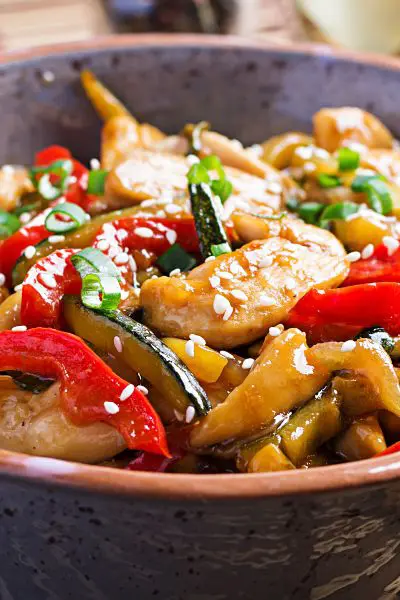 Pollo, apio, pimentón verde, y roja, cebolla roja, zanahoria.