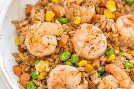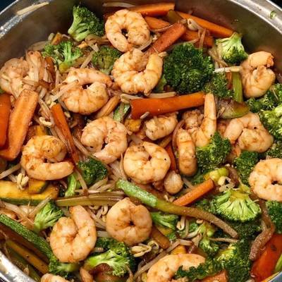 Camarones, apio, pimentones verde y rojo, cebolla, roja, y zanahoria.