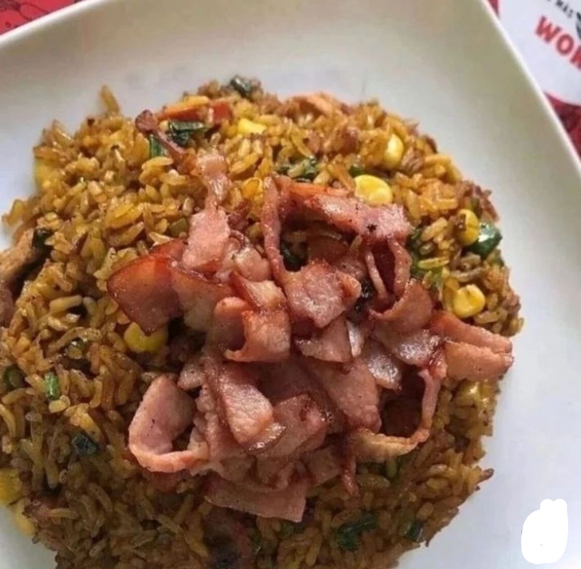 Arroz con trocitos de pollo, caman, jamón, carne, cerdo, cebollín y raíz china.