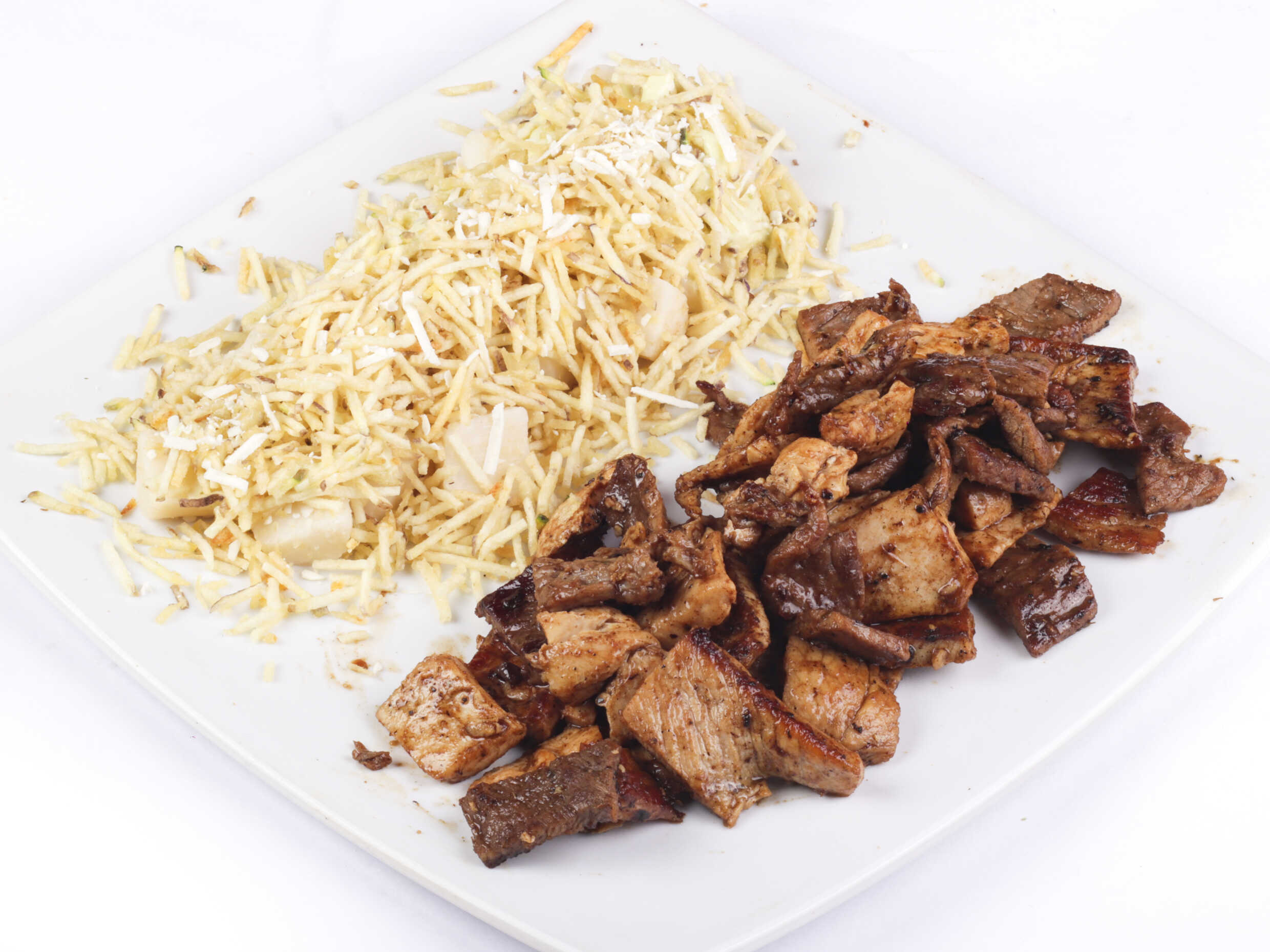 Pollo en trozos, trozos de carne, cerdo en trozos, papa francesas, salchicha tradicional, queso costeño, queso mozarella, tocineta, lechuga, salsa tartara, salsa piña.