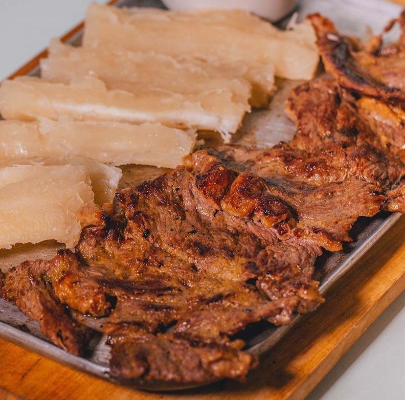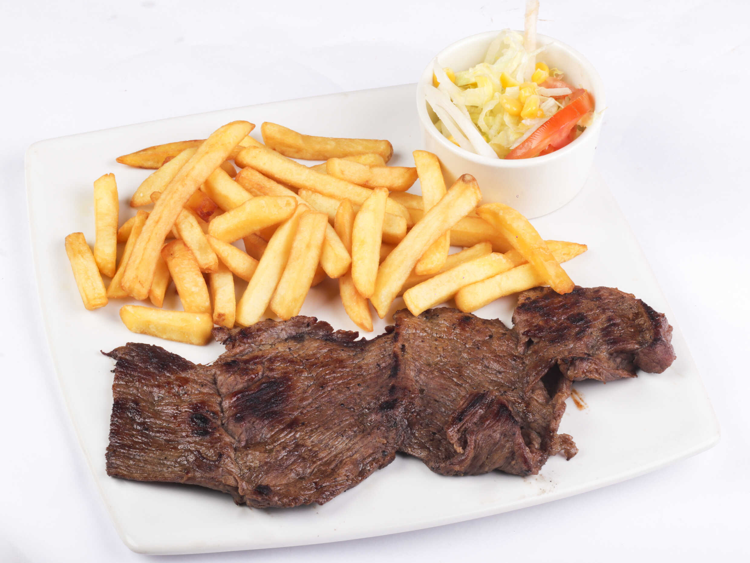 Carne churrasco 350 g, papa o yuca, lechuga, tomate, cebolla, salsa tártara.