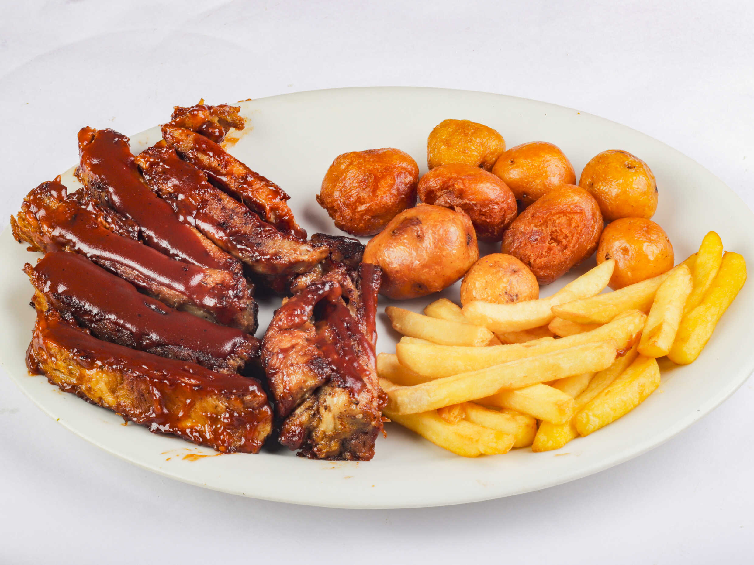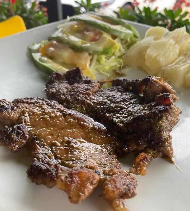 Costillas de cerdo bañadas en salsa BBQ, yuca o papa cocida, lechuga, tomate, cebolla, salsa tártara.