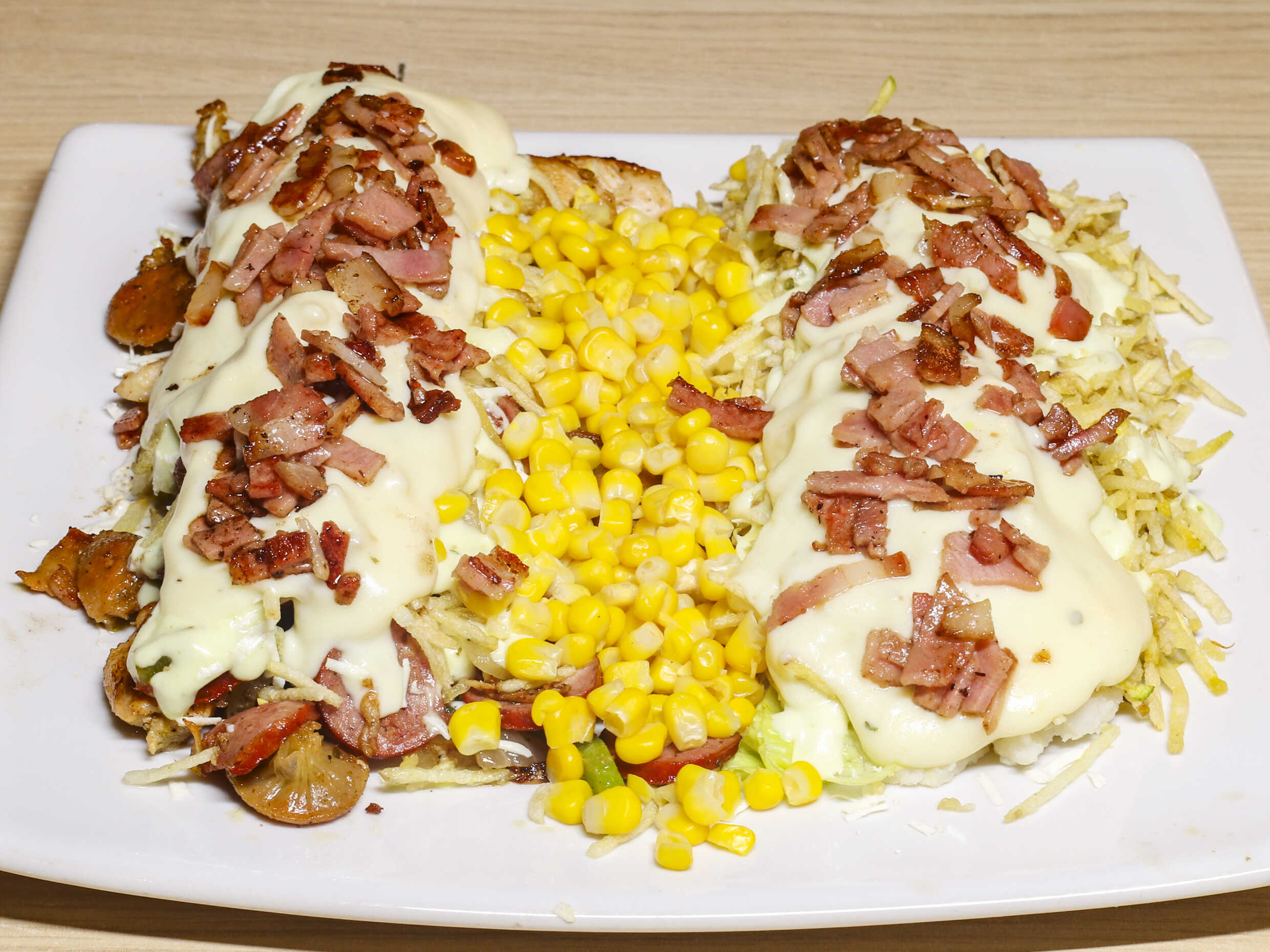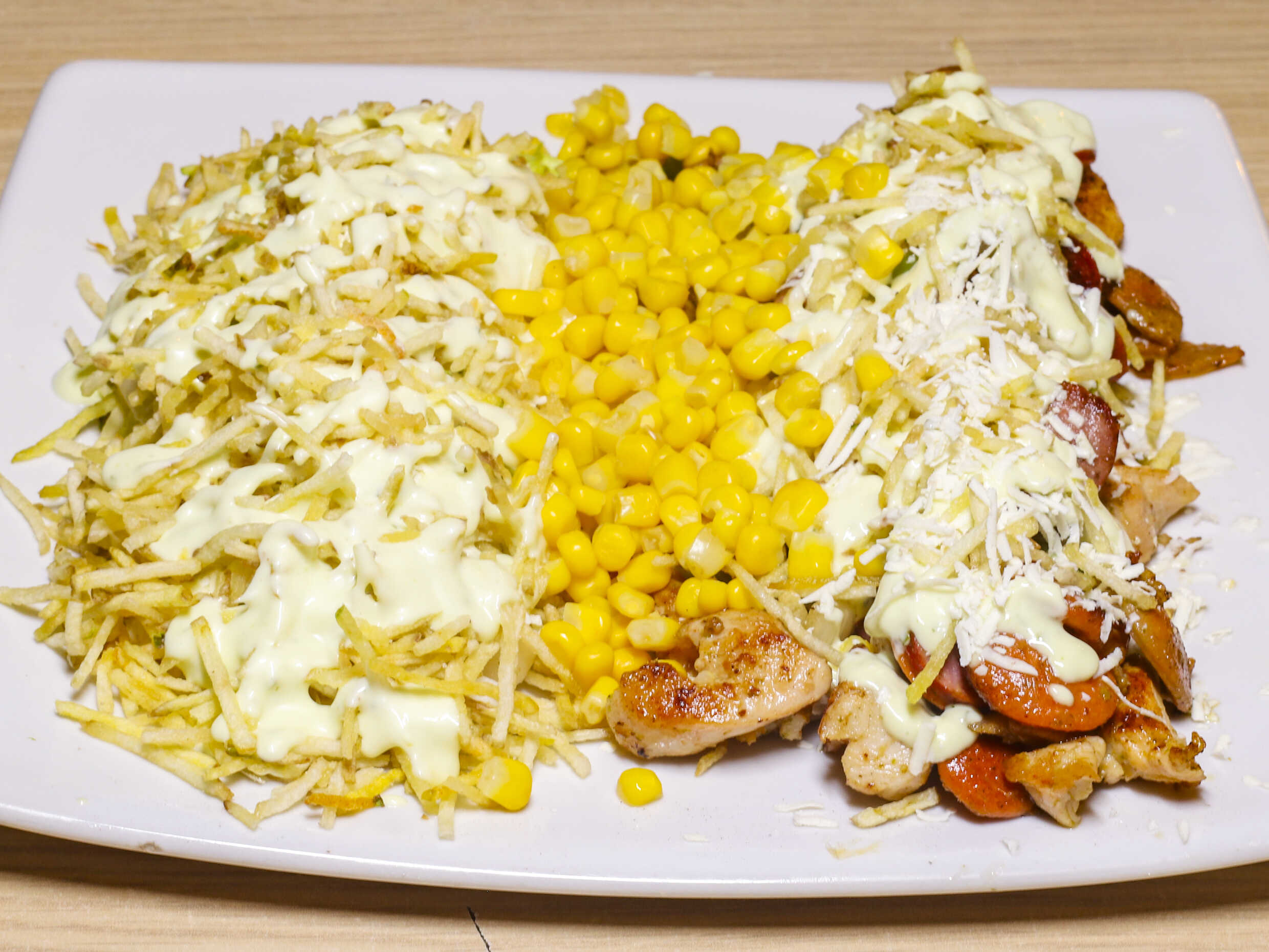 Pollo en trozos, salchicha ranchera, salchicha suiza, queso mozarella, piña en trozo, papa francesa, papa criolla frita, salchicha tradicional, queso costeño, queso mozarella, pimentón, tocineta, cebolla salteada, lechuga, salsa tartara, salsa piña.