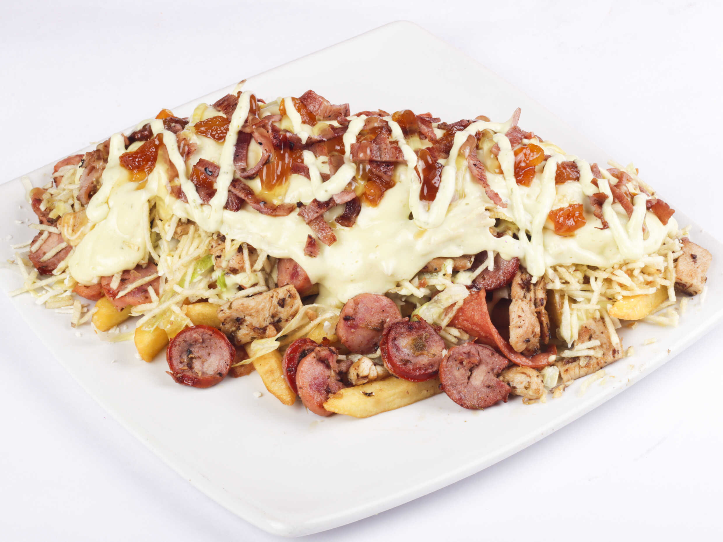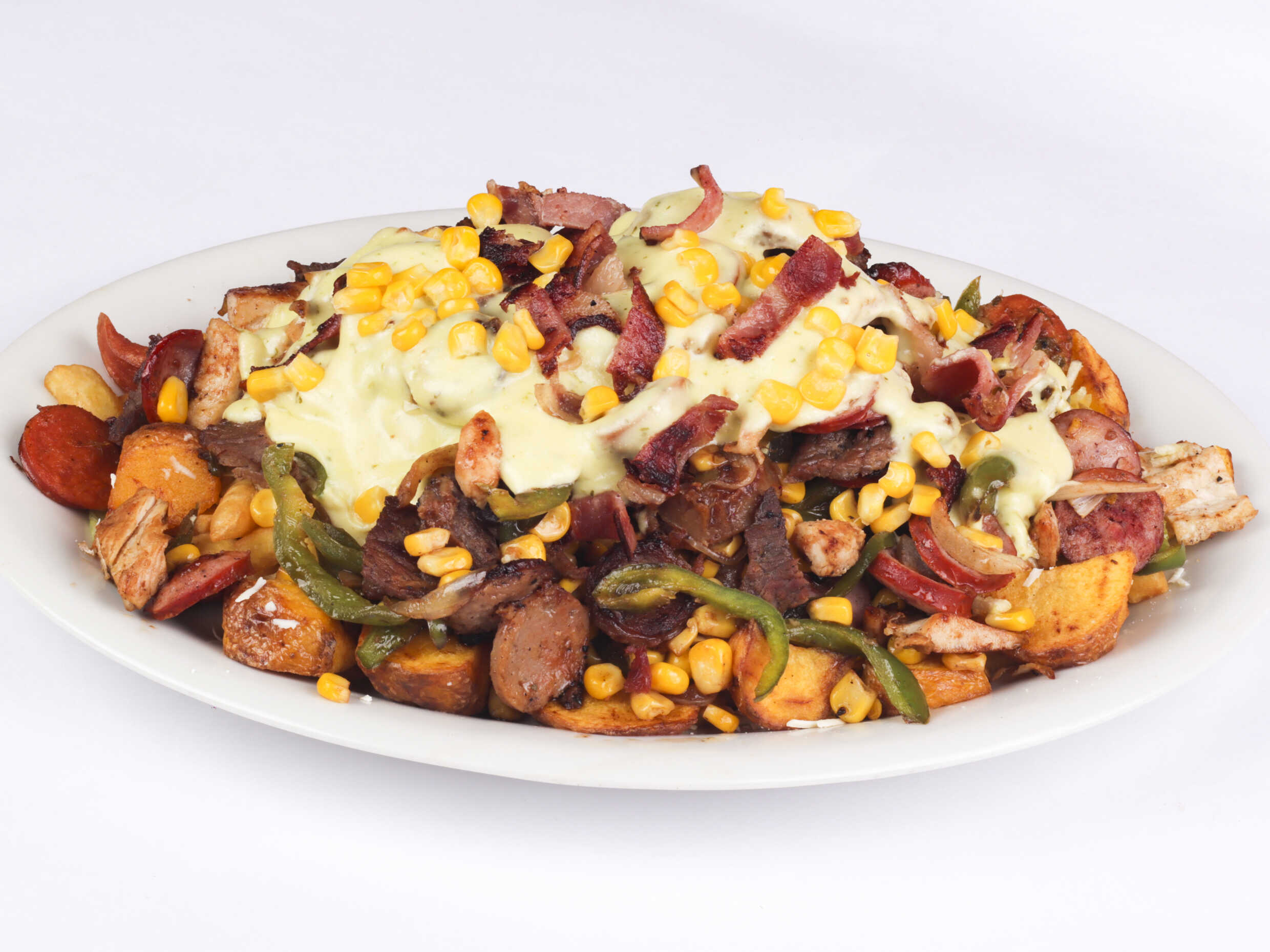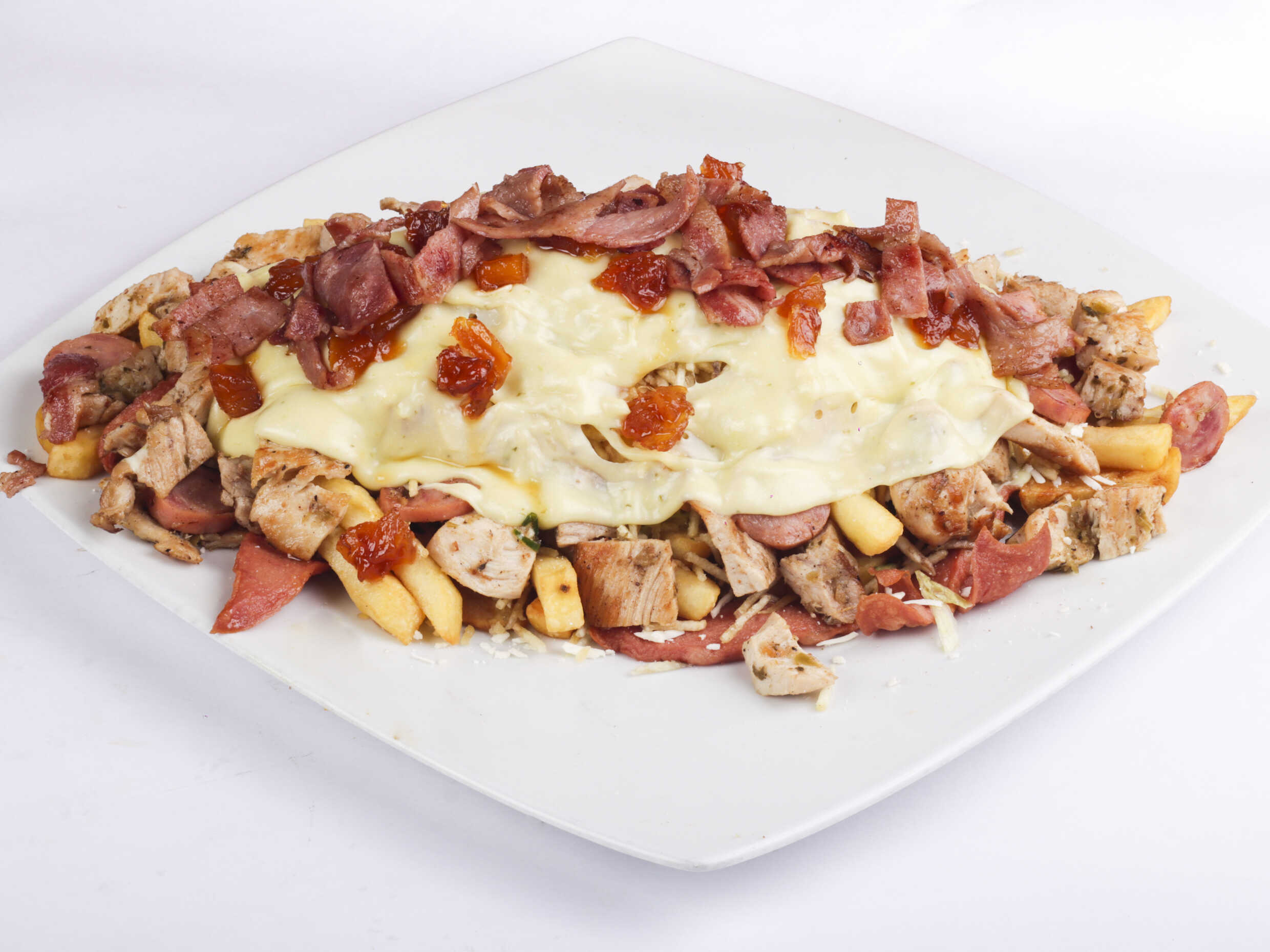 600 g De papa a la francesa, pollo en trozos, chorizo, butifarra, salchicha suiza, carne en trozos, salchicha tradicional, maíz, tocineta, queso mozarella.