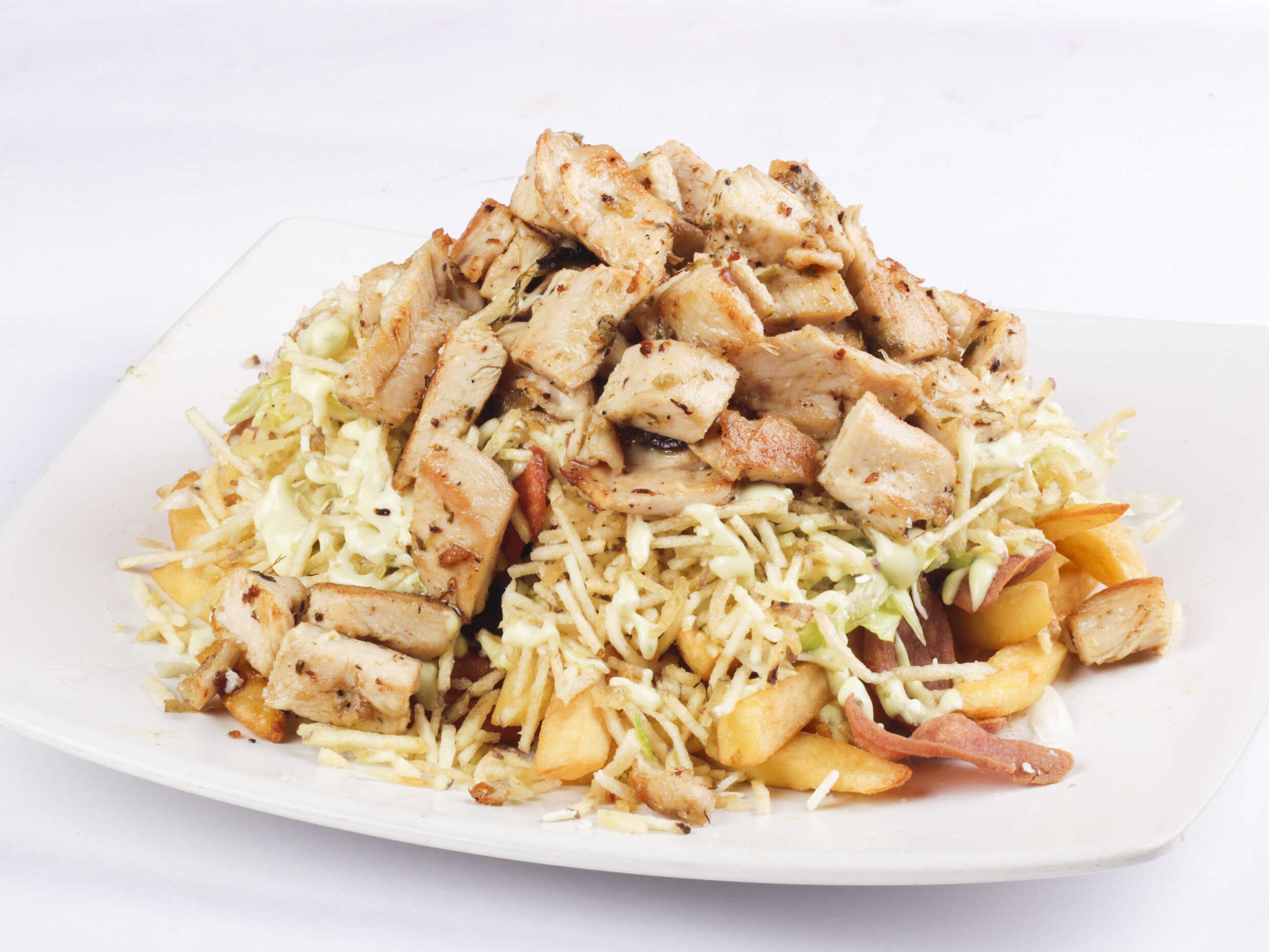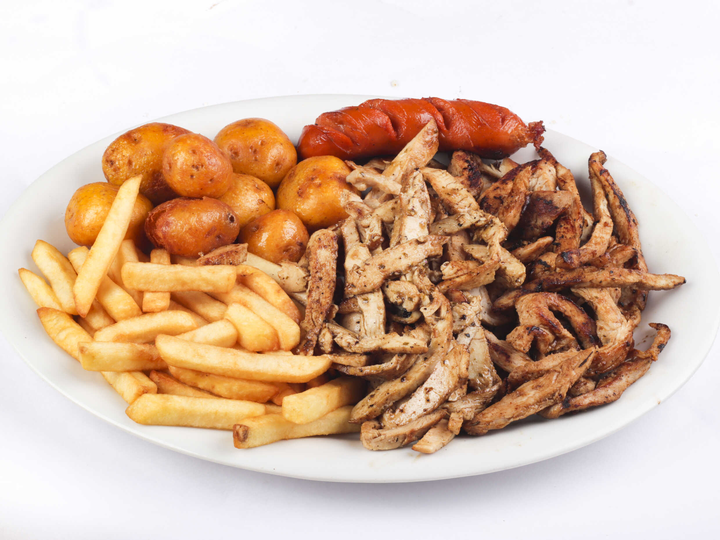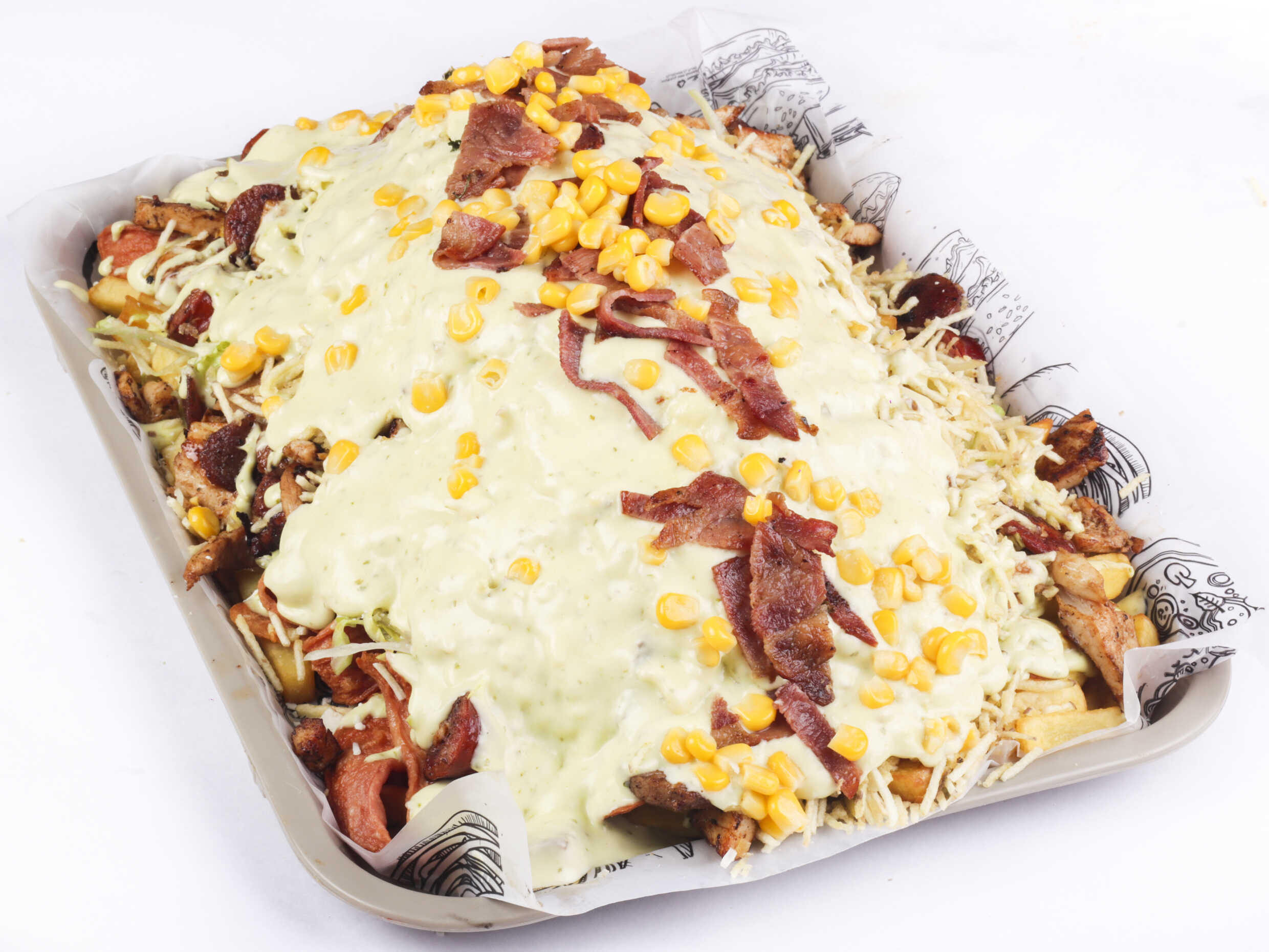 600 g De papa a la francesa, pollo en trozos, chorizo, butifarra, salchicha suiza, carne en trozos, salchicha tradicional, maíz, tocineta, queso mozarella.