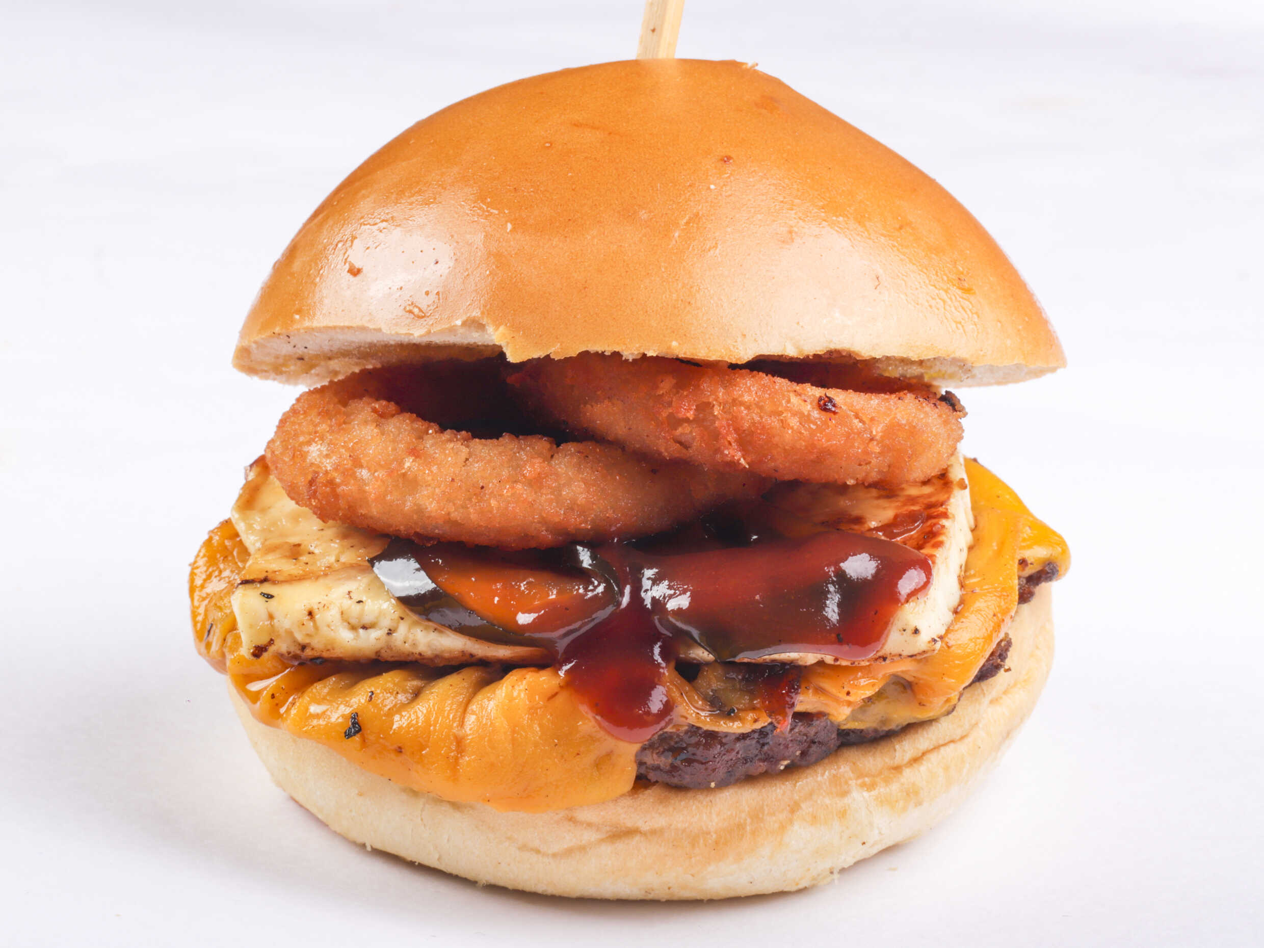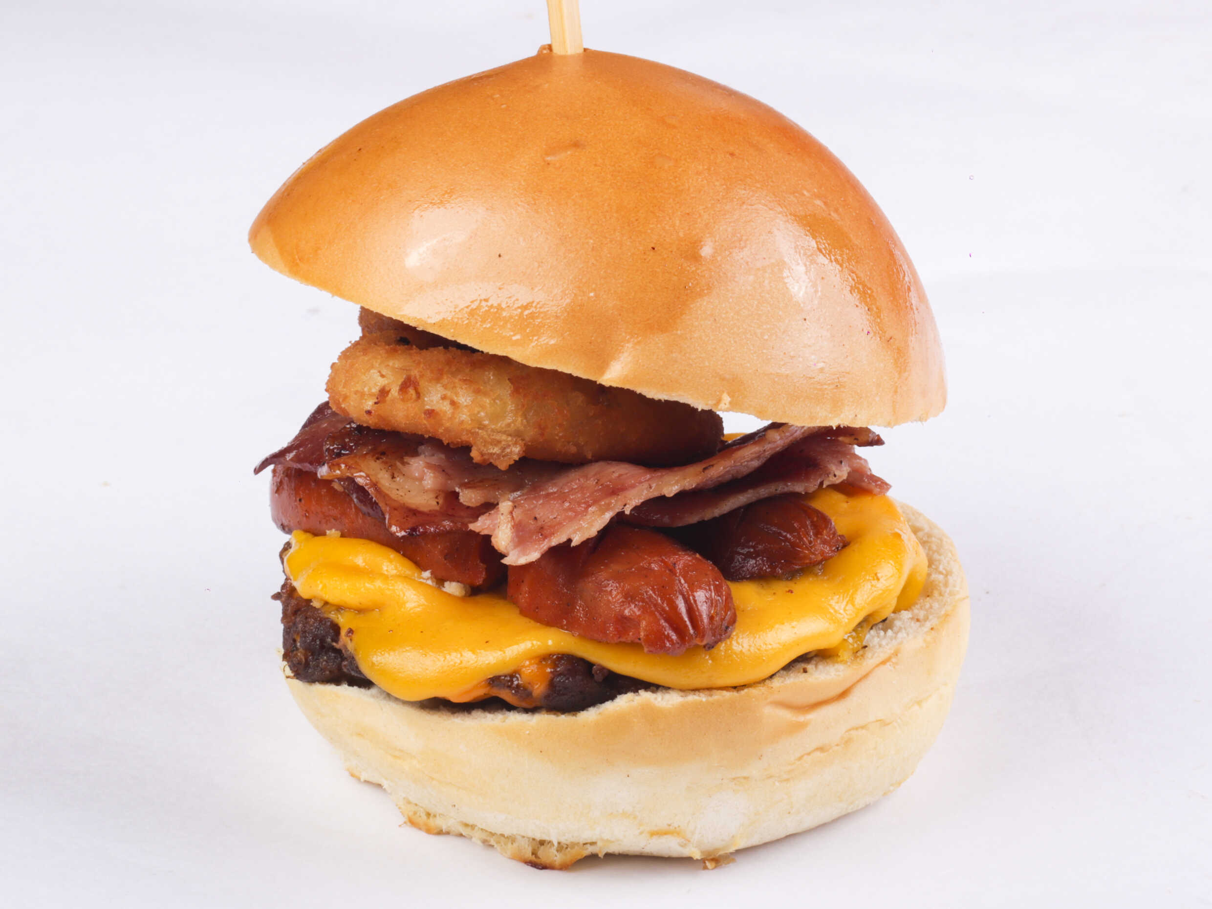 Pan, porción de carne, chorizo artesanal, queso mozarella, queso cheddar, aros de cebolla, tomate, lechuga, salsa tártara, salsa piña, incluye papas a la francesa.