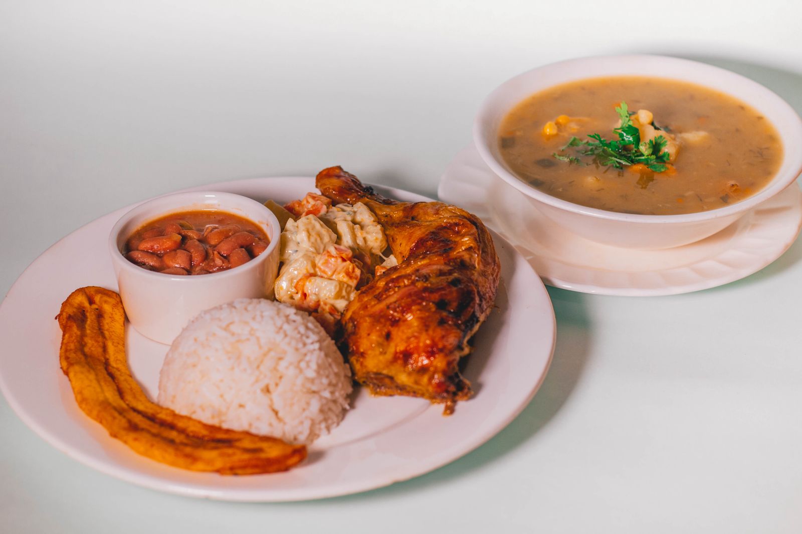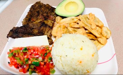 Carne asada, acompañado de arroz blanco, tajadas, consomé del día y Ensalada
