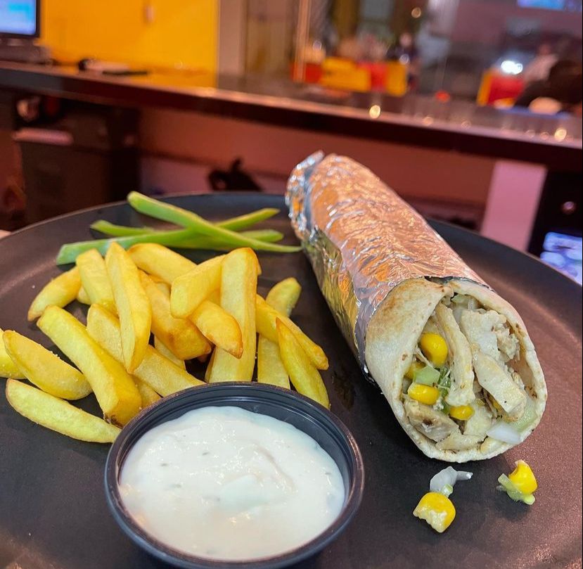 Trozos de lomo fino, pan arabe, pimentón, cebolla, tomate, maíz, lechuga, tahine y salsa de pollo.