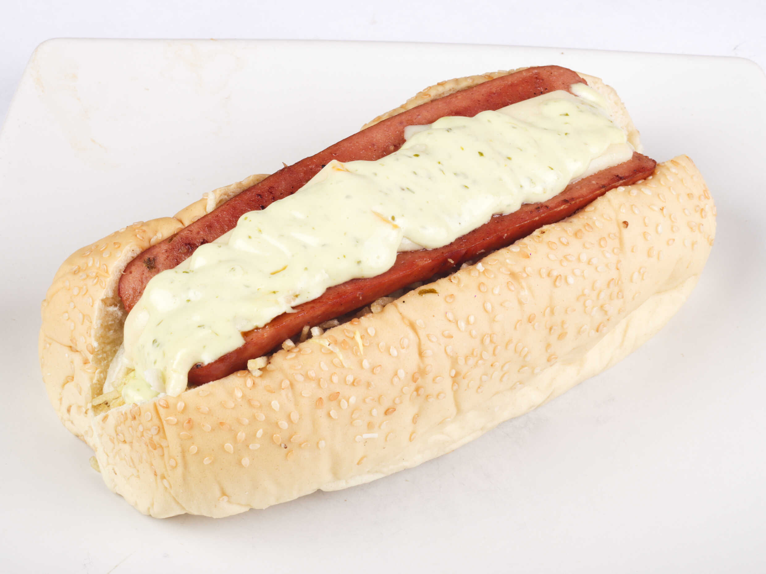 Salchicha suiza, pan, papa ripio (chongo), lechuga, queso mozarella, salsa tartara.
