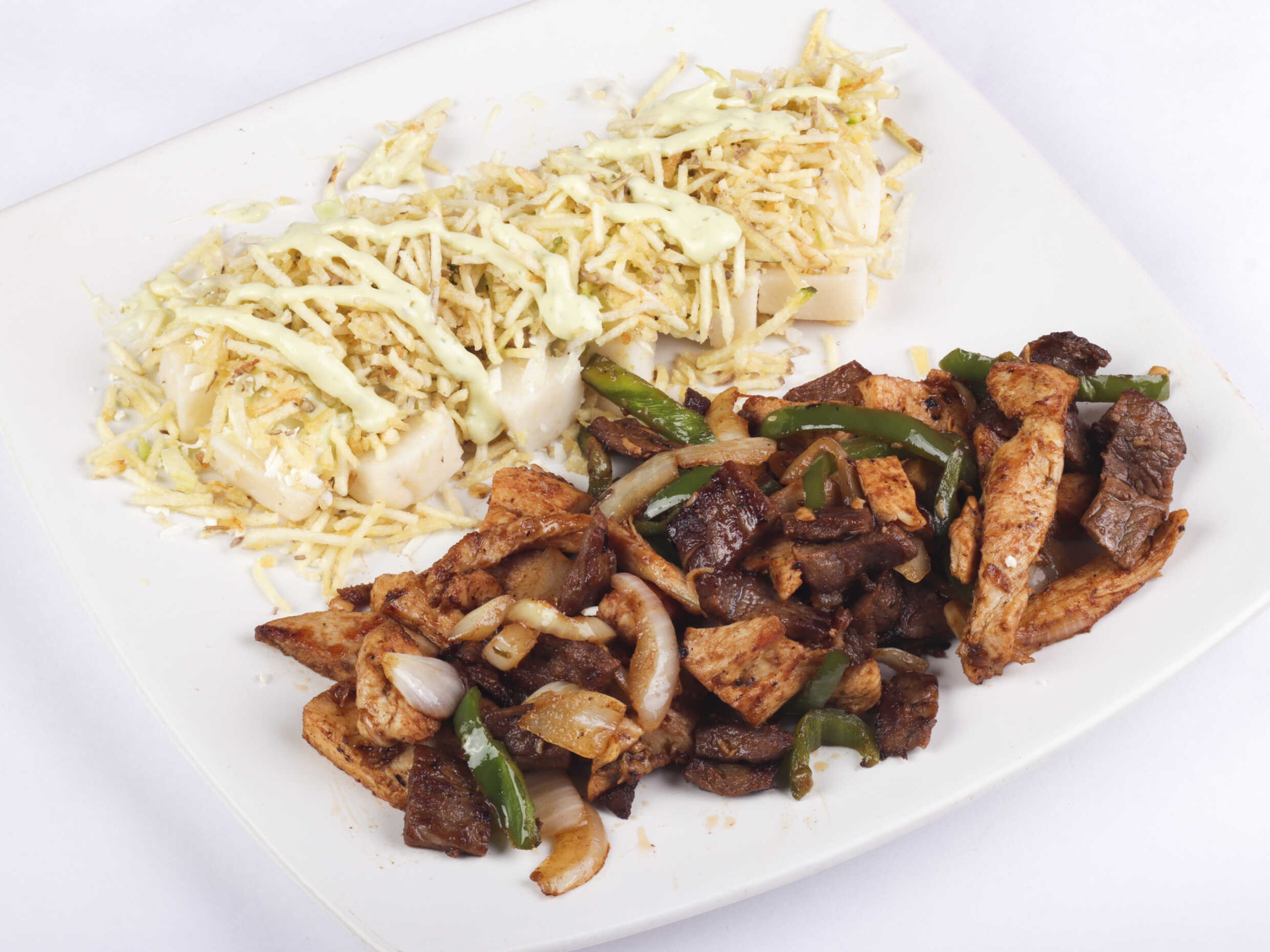 Carne punta gorda 300 g, papa o yuca, lechuga, tomate, cebolla, salsa tártara.