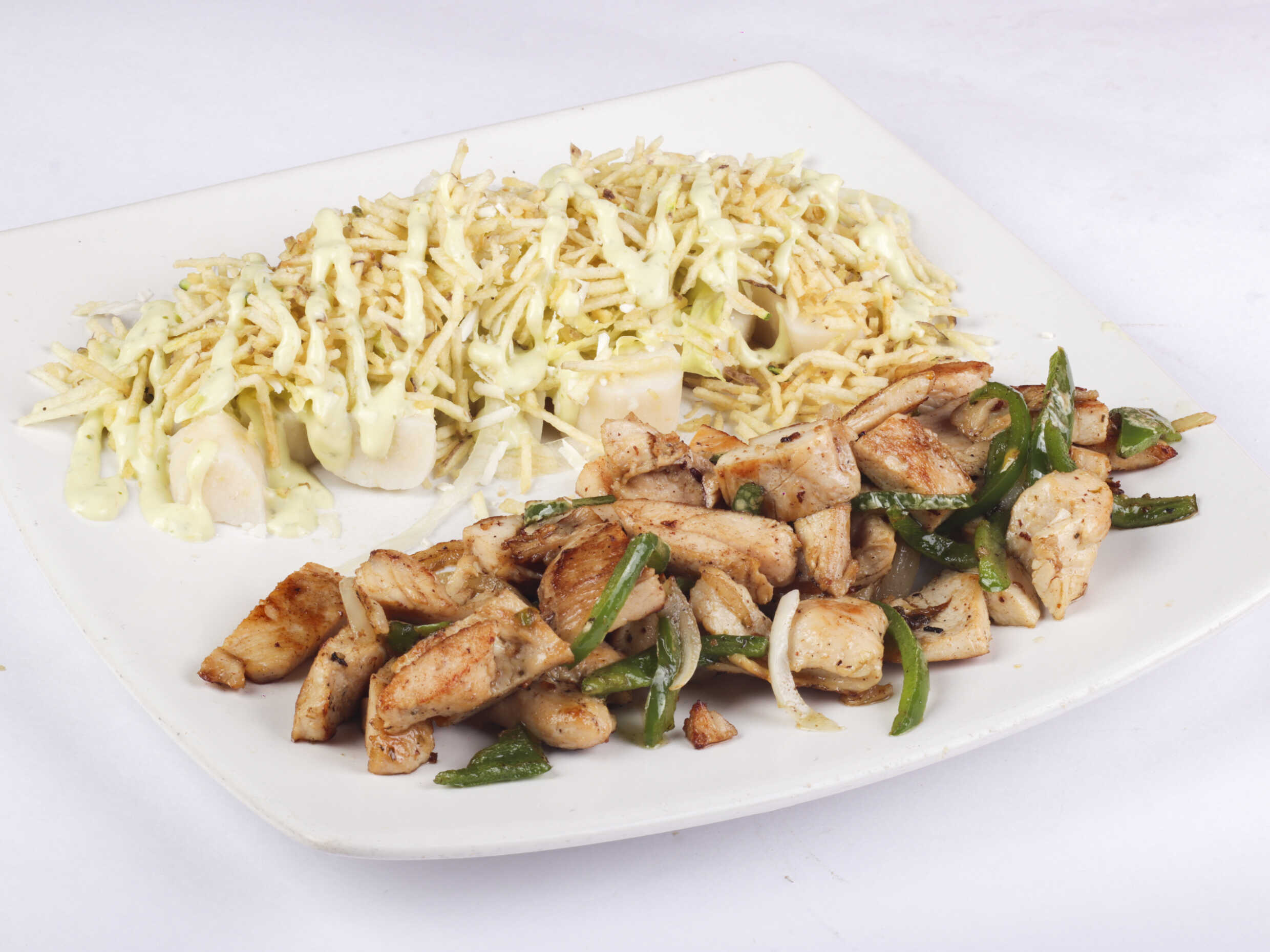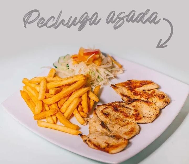 Pechuga 300 g, papa o yuca, lechuga, tomate, cebolla, salsa tártara.