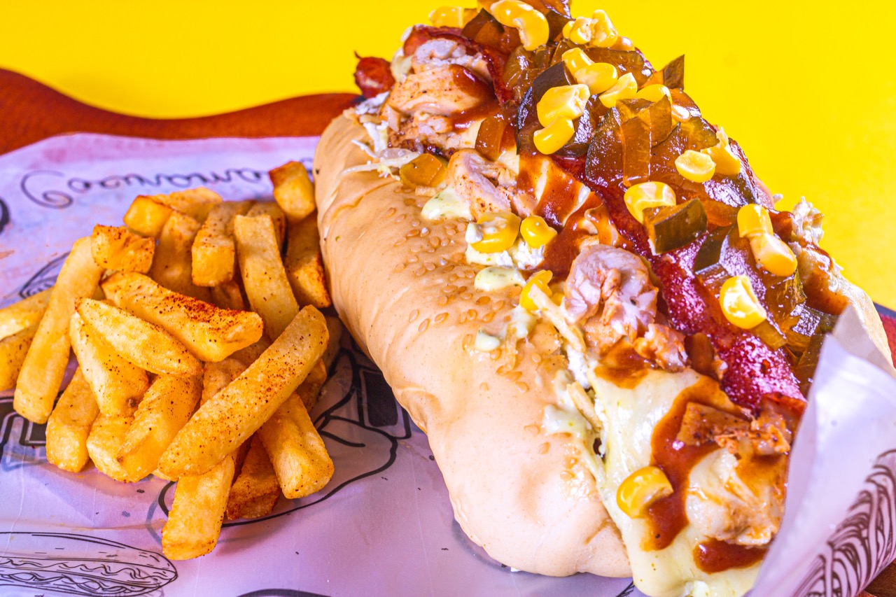 Salchicha americana, pan, papa ripio (chongo), lechuga, pollo, tocineta, pepinillos, queso mozarella, maíz, salsa tartara.