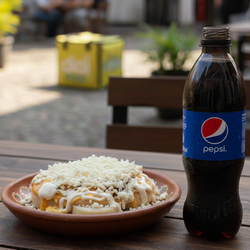 Salchipapa de Pollo acompañado de gaseosa Pep 250 ml