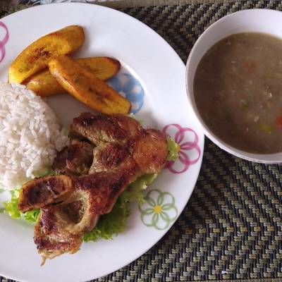 Cerdo barbacoa, acompañado de arroz blanco, tajadas, consomé del día y Ensalada