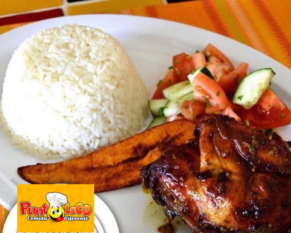 Pernil de pollo frito acompañado de arroz, tajada y ensalada del dia + bebida del dia.